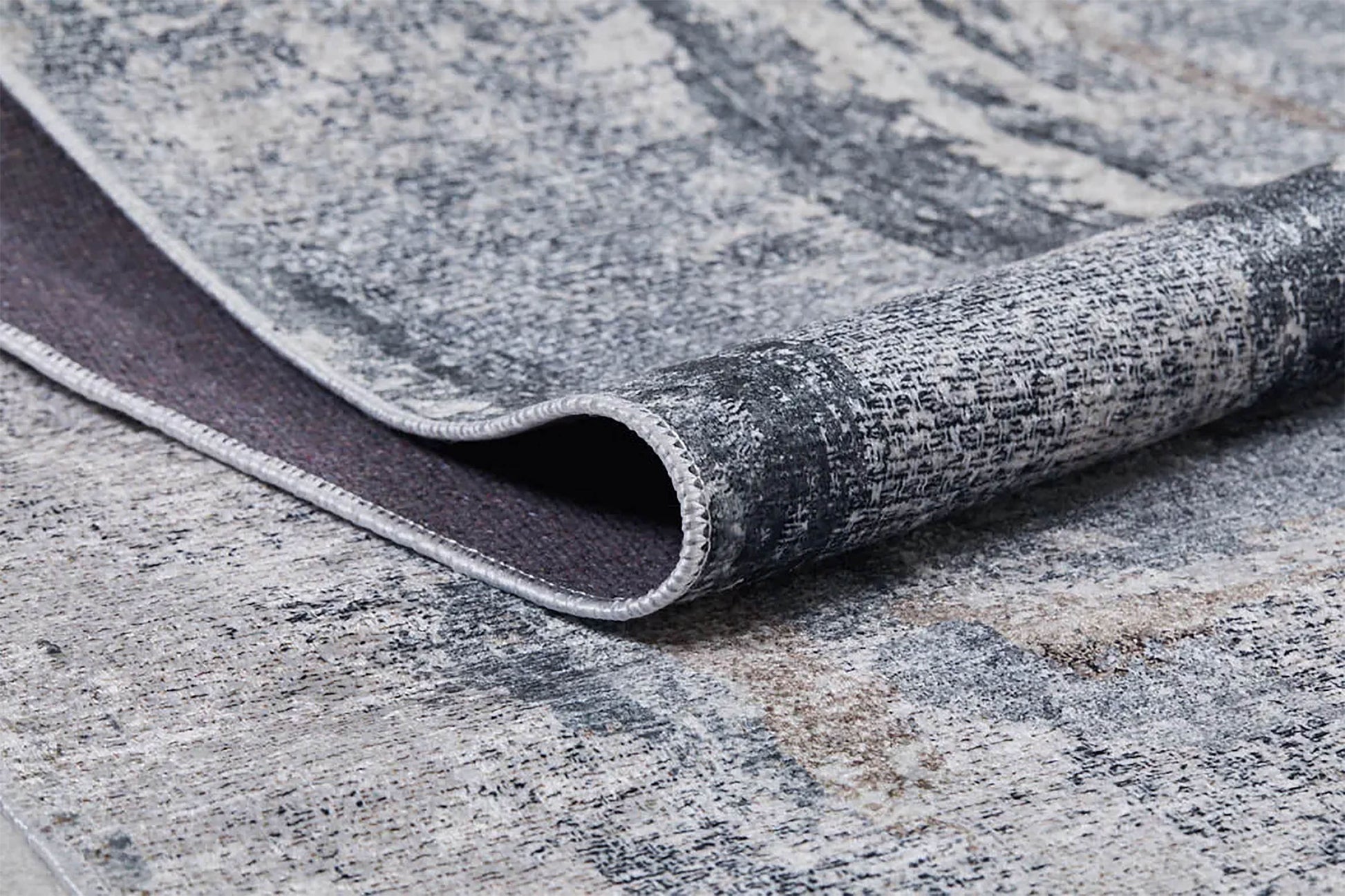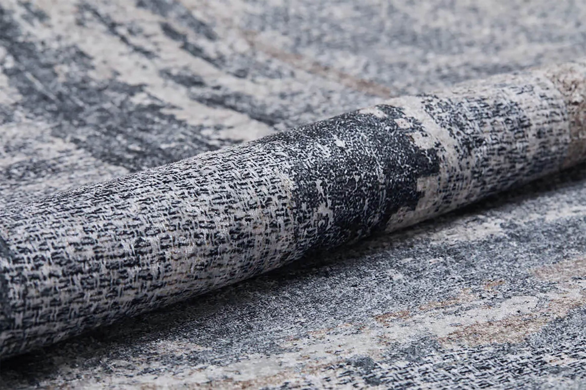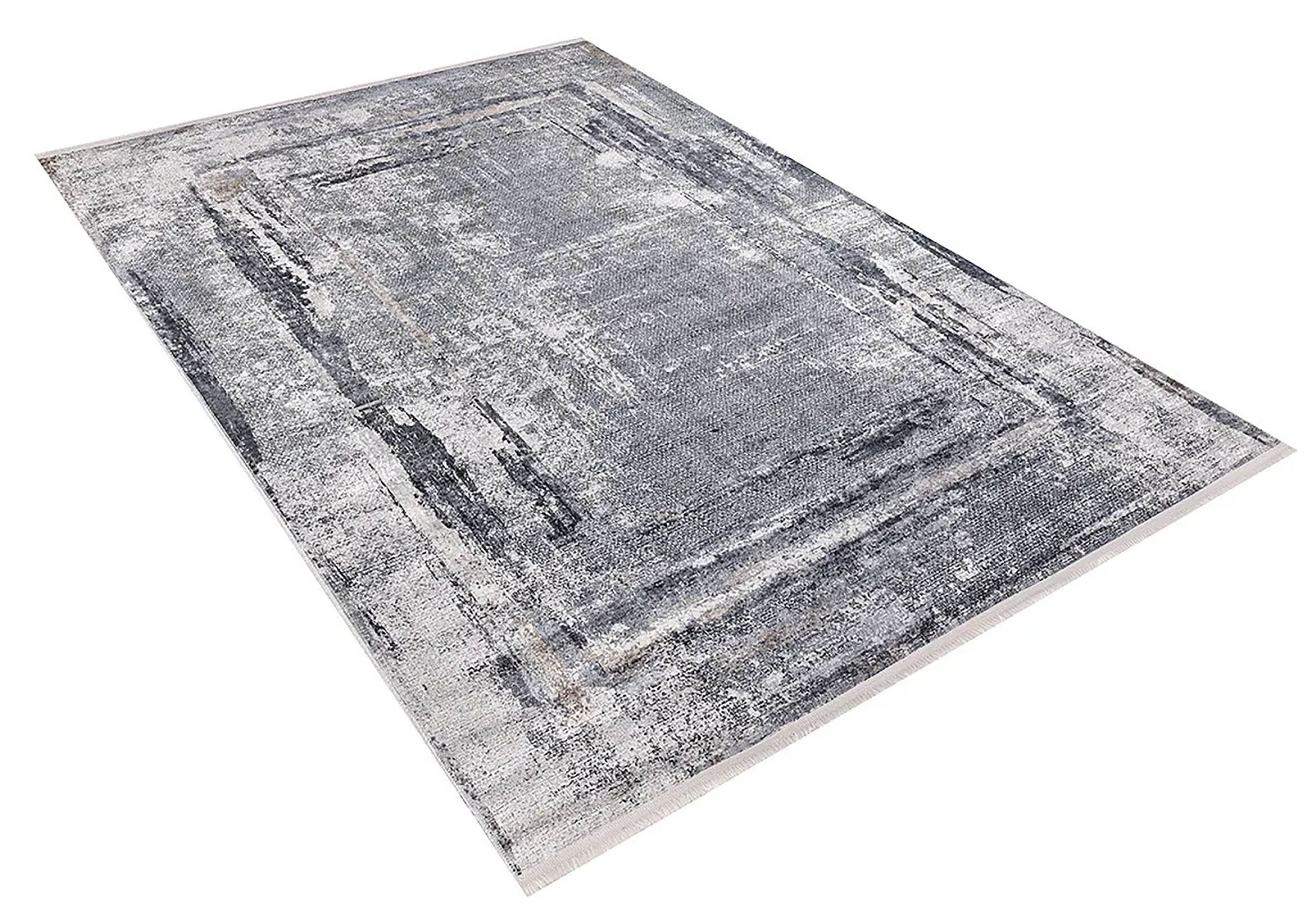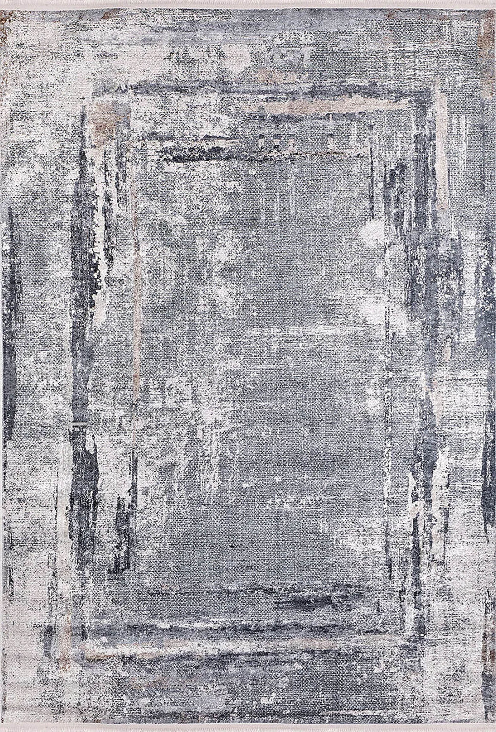 Füme ve açık gri tonlarında eskitme görünümlü zemin üzerinde, silik beyaz ve koyu gri fırça darbelerinden oluşan soyut dikdörtgen çerçeveye sahip modern halı. Minimalist ve sanatsal mekanlar için idealdir.