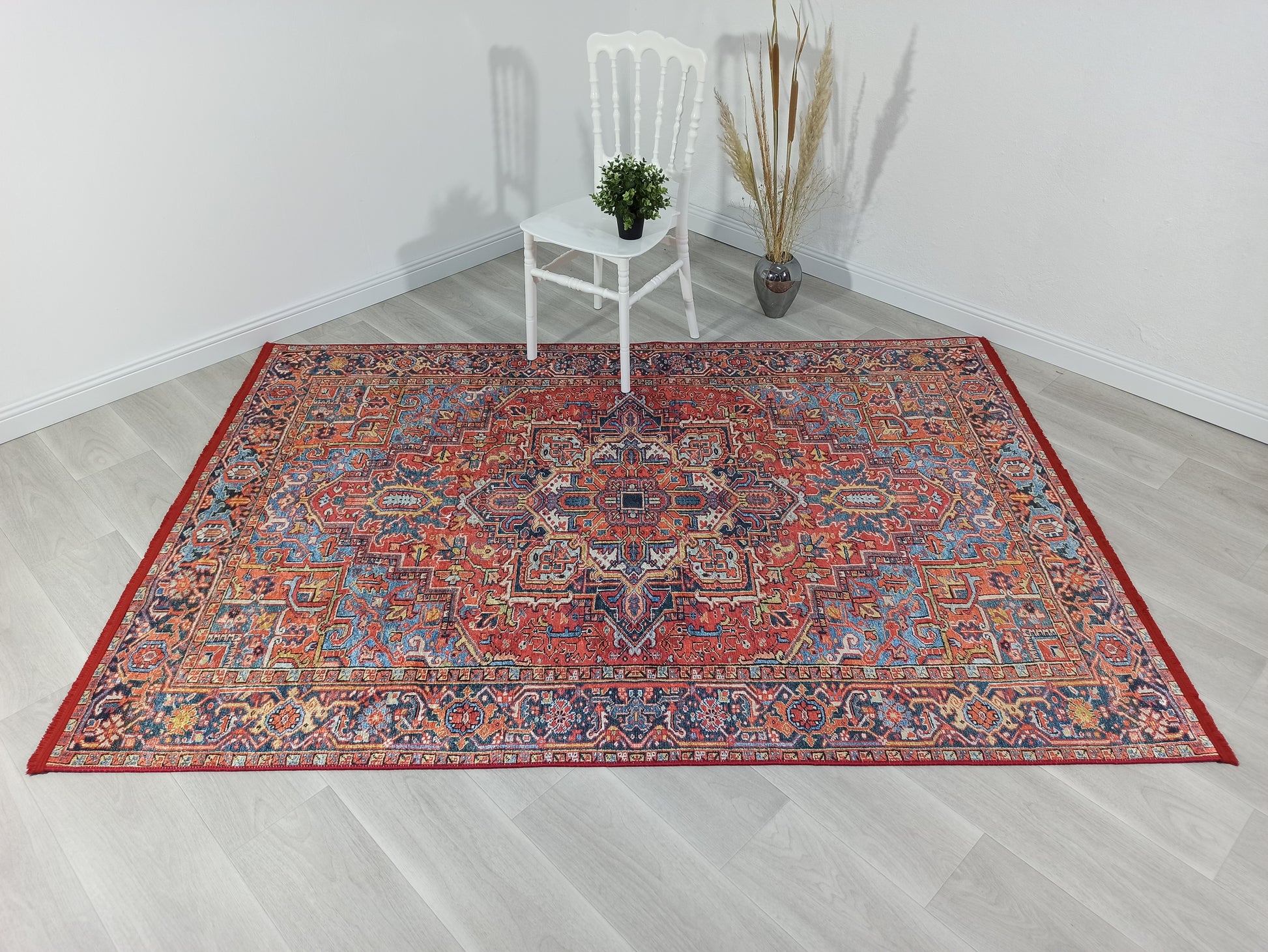 Güçlü kırmızı zemin üzerinde mavi, turuncu ve sarı gibi canlı tonların hakim olduğu, büyük ve otantik medallion desenle dikkat çeker. Bu halı, geleneksel motifleri ve zengin renk geçişleriyle mekana bohem, vintage ve enerjik bir hava katar. Yumuşak yüzeyi ve kaymaz tabanı sayesinde büyük salonlar, oturma odaları ve yemek odaları için hem estetik hem de güvenli bir zemin sunar. Dekorasyonunda karakter ve canlılık arayanlar için mükemmeldir.