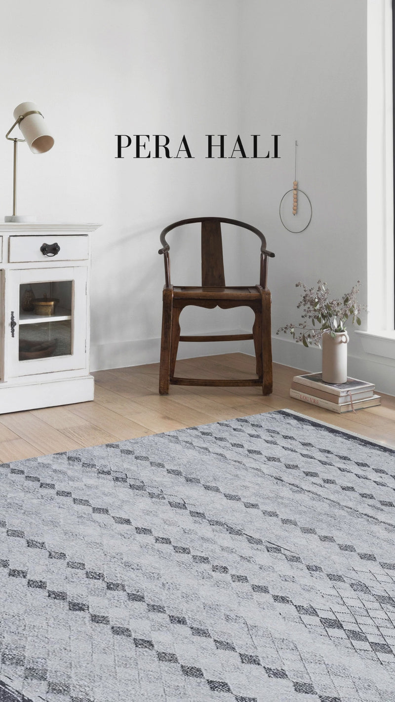 Gri geometrik antik vintage halı, oryantal esintilerle harmanlanmış klasik ve sofistike bir tasarım sunar. Gri tonlarının zarif birleşimi, antik tarzı vurgularken soluk desenleri ile yumuşak ve dengeli bir görünüm sağlar. Özel baskı tekniği sayesinde her düğüm detaylı bir dokuma efekti ile yansıtılarak halının dokusuna zarif bir derinlik kazandırılmıştır.