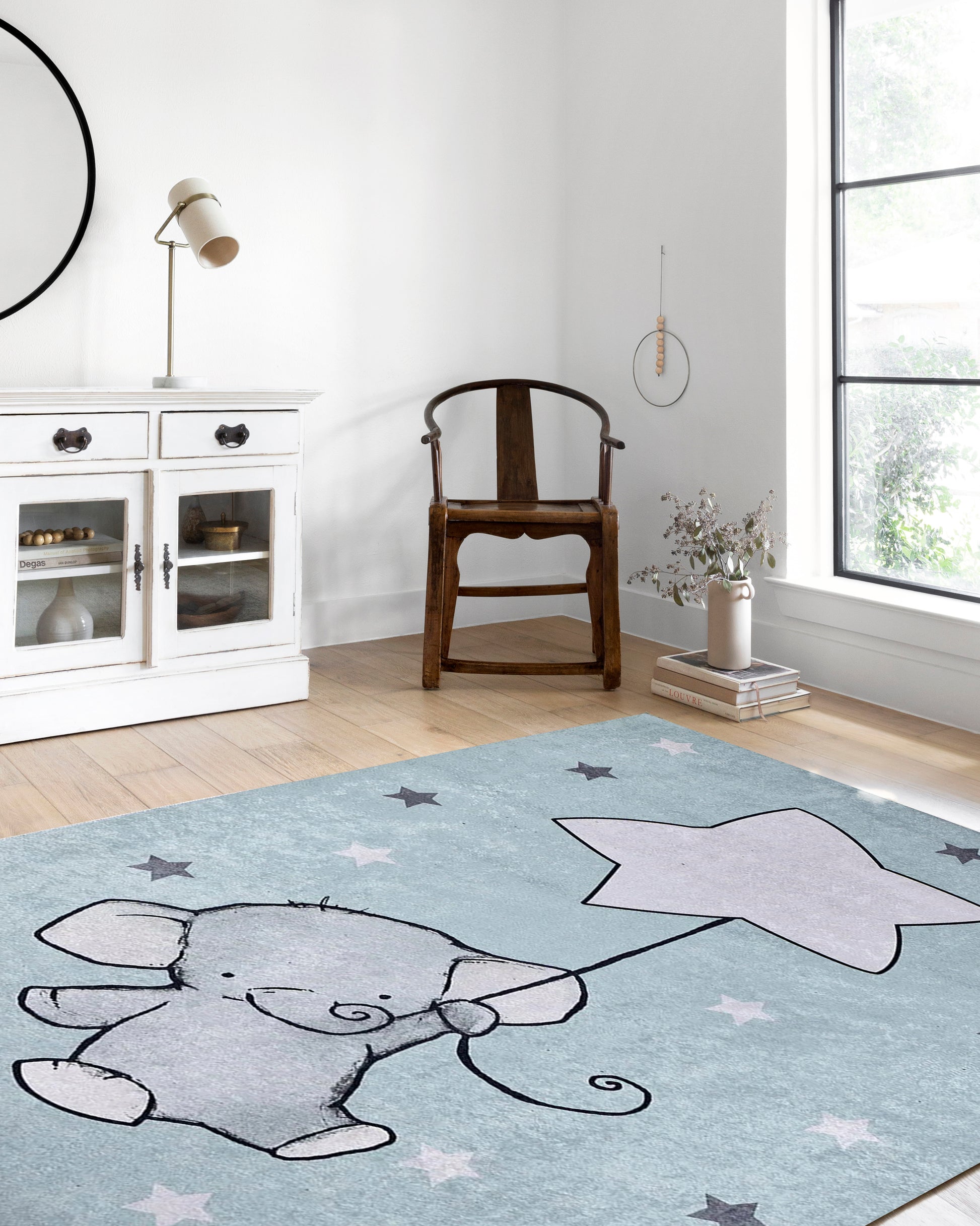 Gri Mavi Fil ve Yıldız Desenli Yıkanabilir Çocuk Halısı
