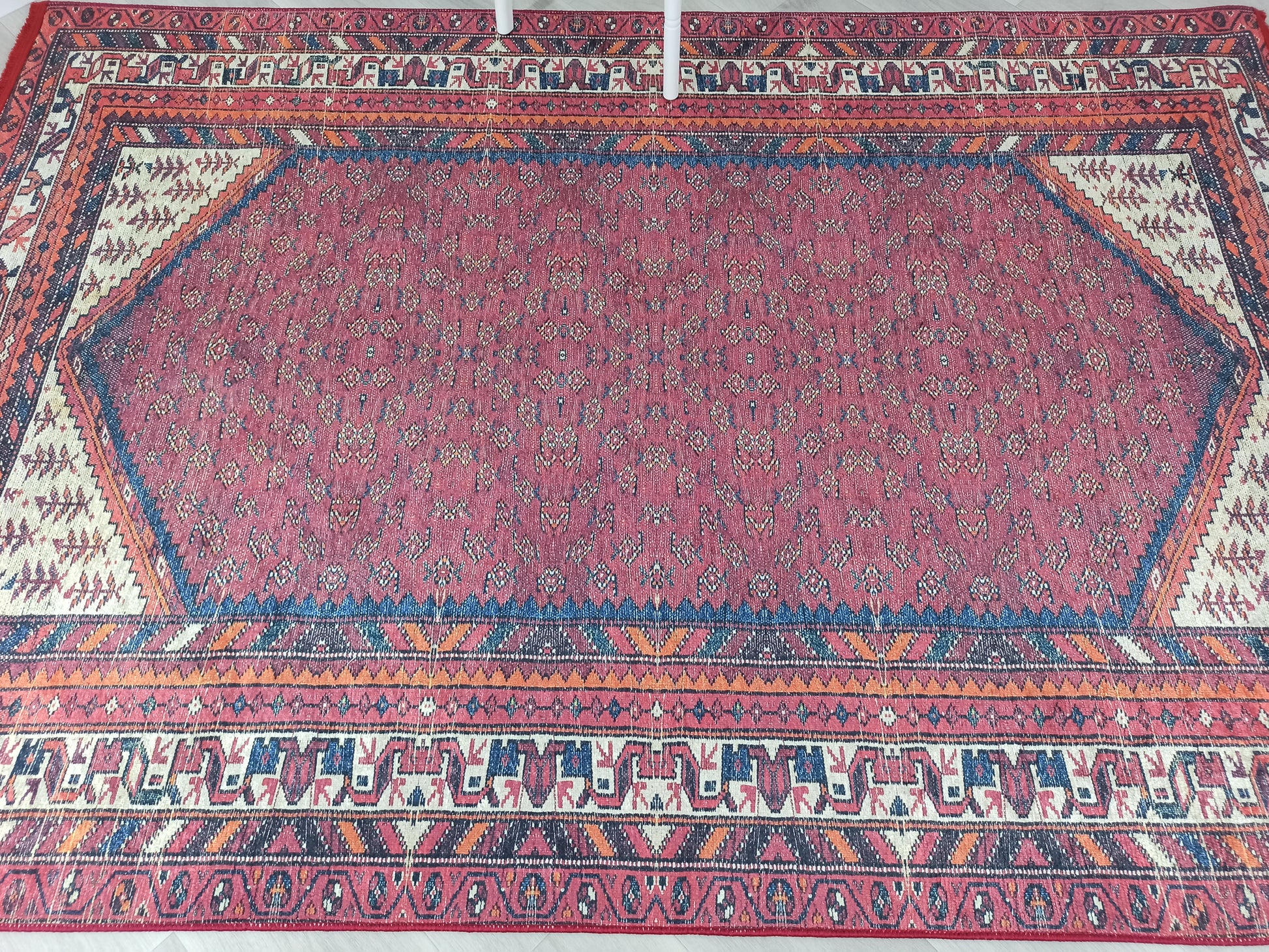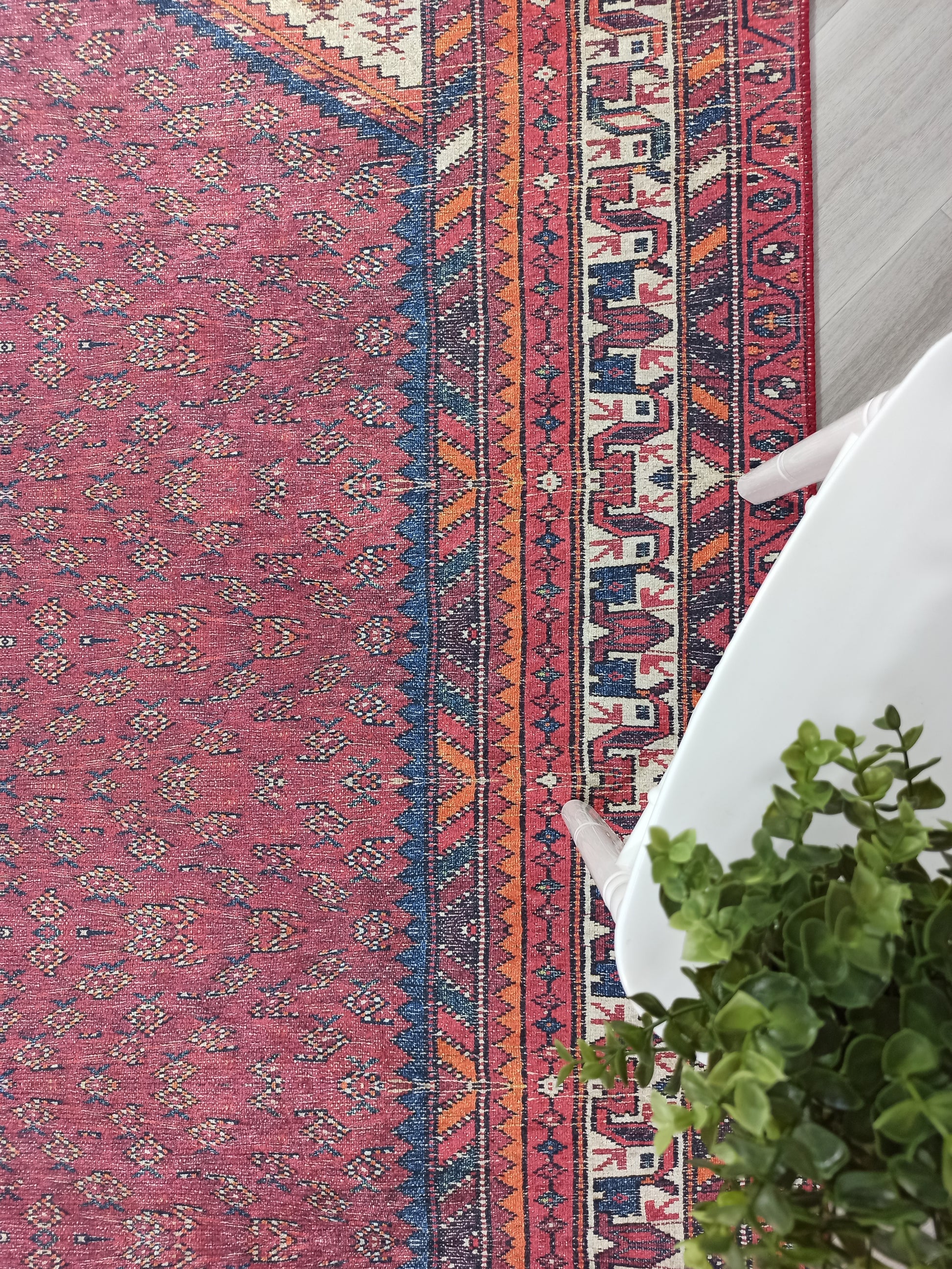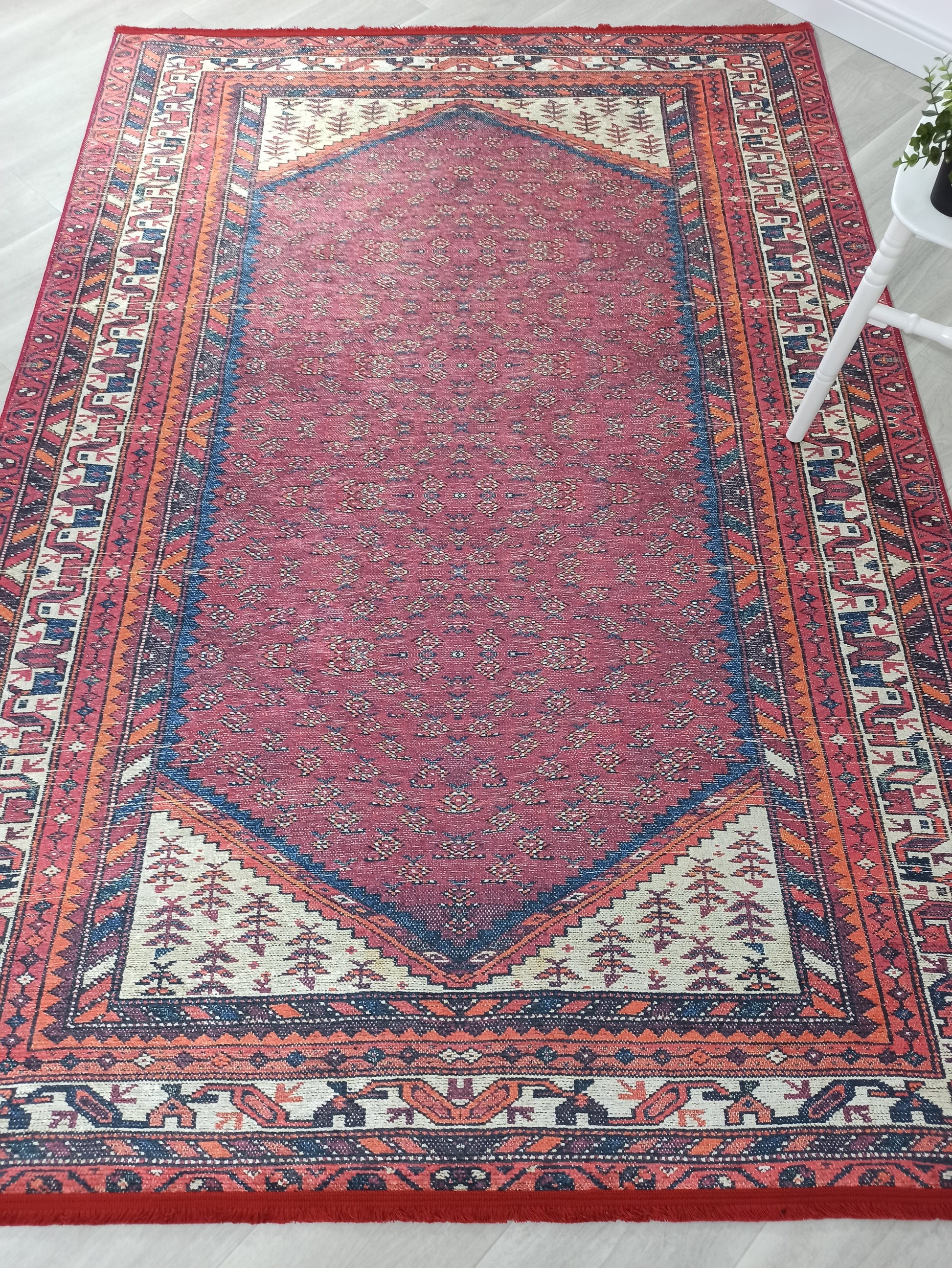 Derin koyu kırmızı (bordo) merkez paneli ve geleneksel motiflerle bezenmiş otantik bordürleriyle mekana sıcak, zengin ve asil bir hava katar. Bordürdeki krem, mavi ve turuncu detaylar, halının karakterini güçlendirir. Eskitme görünümü, klasik ve modern dekorasyonları harmanlar. Yumuşak dokusu ve kaymaz tabanı sayesinde salon, yemek odası ve geniş antreler için hem şık hem de güvenli bir zemin çözümüdür.