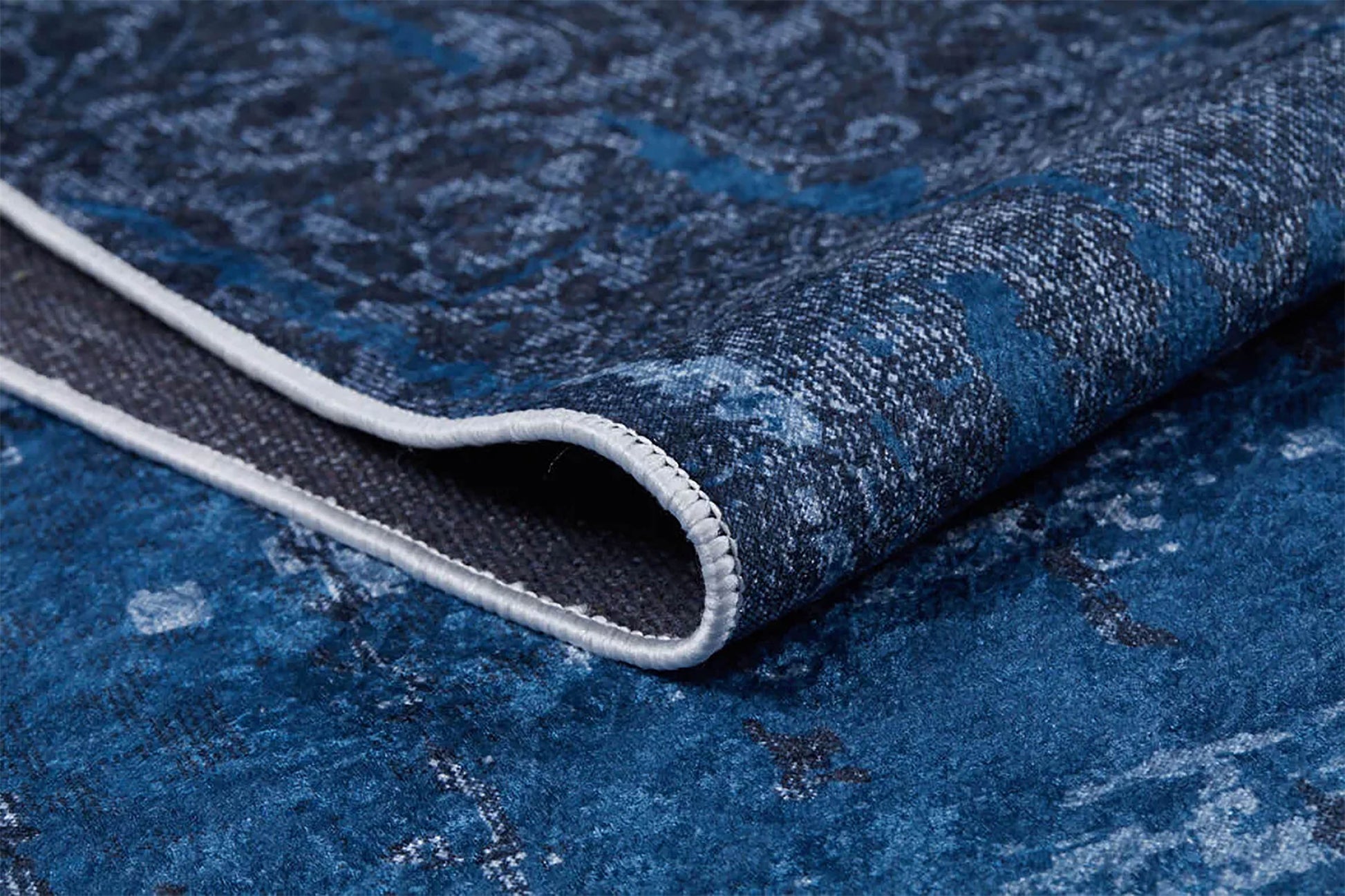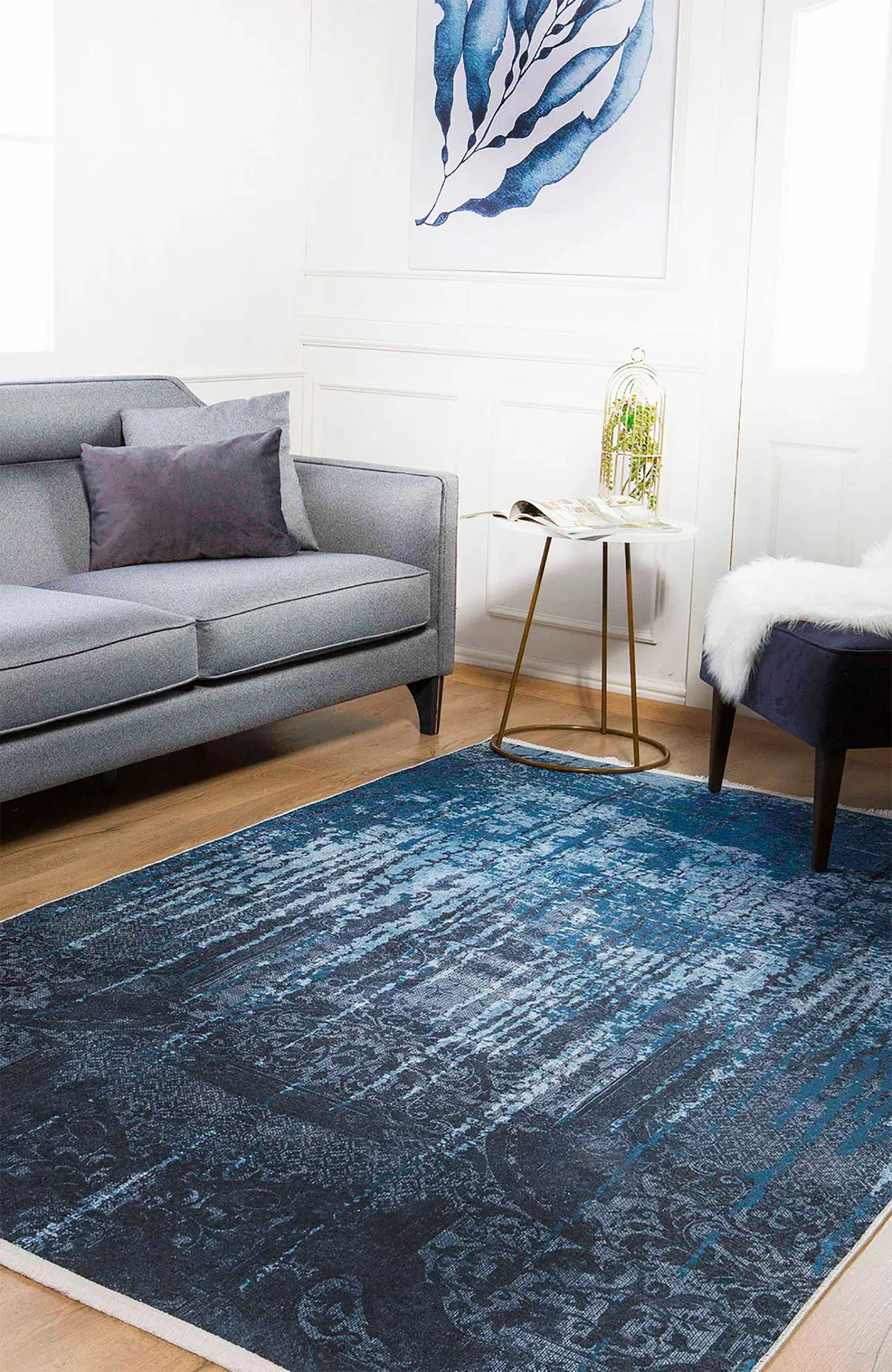 Koyu lacivert ve mavi tonlarında, üst kısımda geleneksel (oryantal) motiflerin yer aldığı, alta doğru soyut damlama (akma) efektiyle modernleşen sanatsal halı. Mekanlara dramatik ve derin bir hava katar.