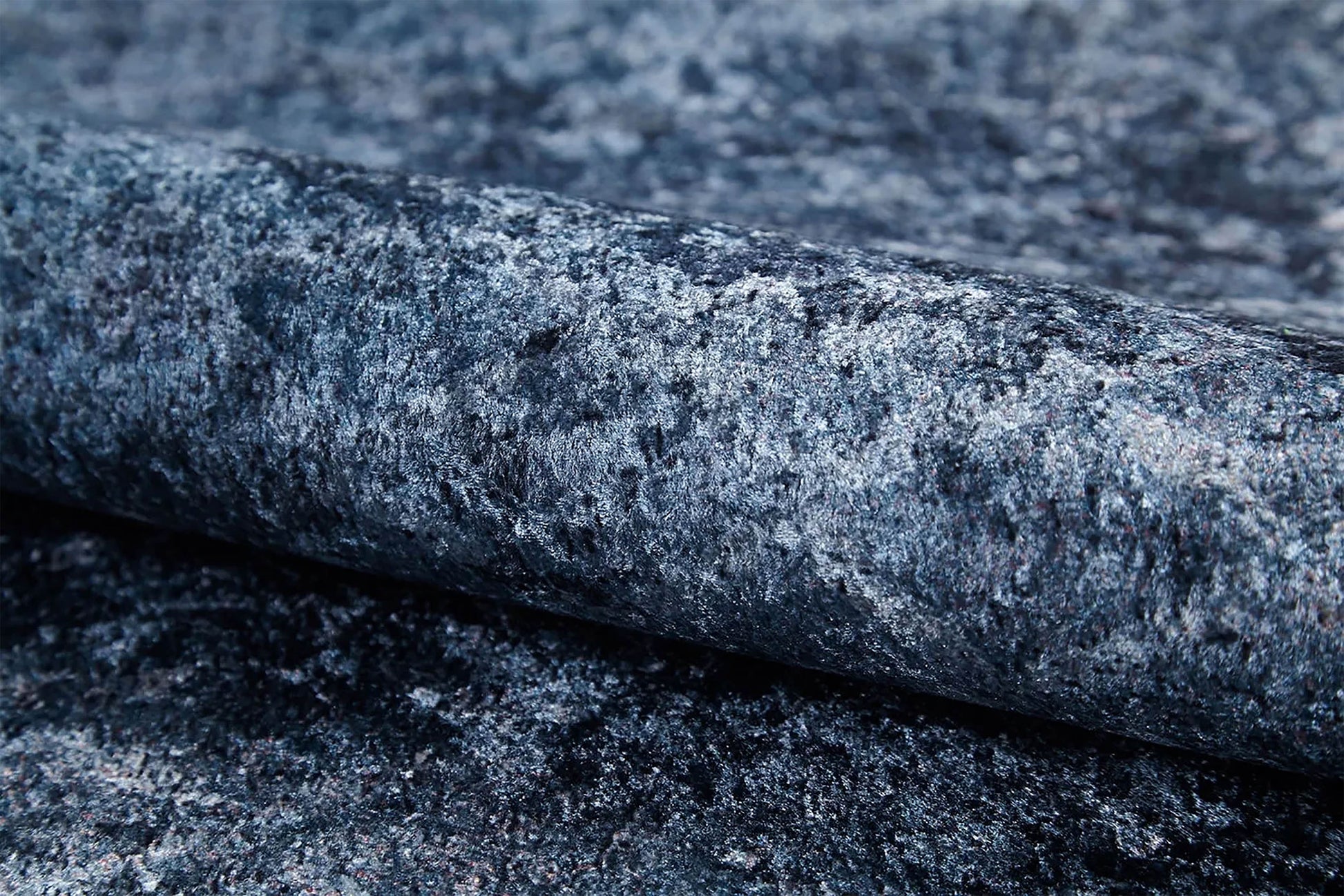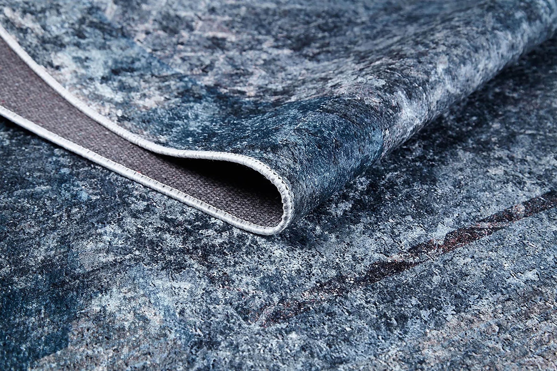 Yoğun mavi ve gri tonlarının sanatsal birleşimiyle soyut ve eskitme (vintage) bir görünüm sunar. Yüzeydeki hafif baklava deseni ve degrade renk geçişleri, halıya modern ve dinamik bir hava katar. Bordür yerine tüm yüzeye yayılan bu tasarım, mekana derinlik ve karakter katar. Yumuşak dokusu ve kaymaz taban özelliği sayesinde oturma odası, yatak odası ve modern dekorasyonlu ofisler için ideal, konforlu ve güvenli bir seçimdir.