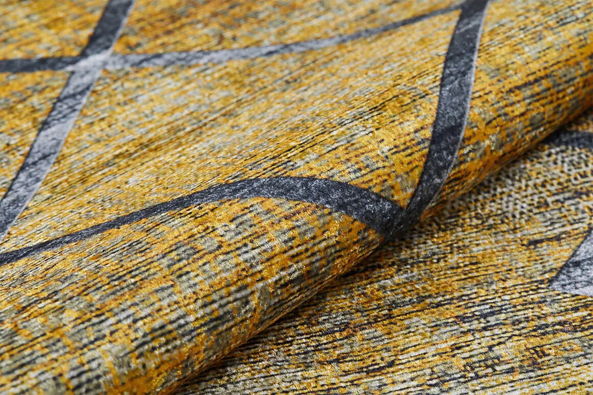 Hardal sarısı ve kahve tonlarındaki eskitme zemin üzerine, koyu gri/siyah renkte baklava kafes deseni işlenmiş modern halıdır. Canlı sarı rengi ve geometrik deseniyle mekana dinamik, bohem ve çağdaş bir enerji katar. Salon ve oturma odaları için ideal, cesur bir zemin dekorasyon parçasıdır.