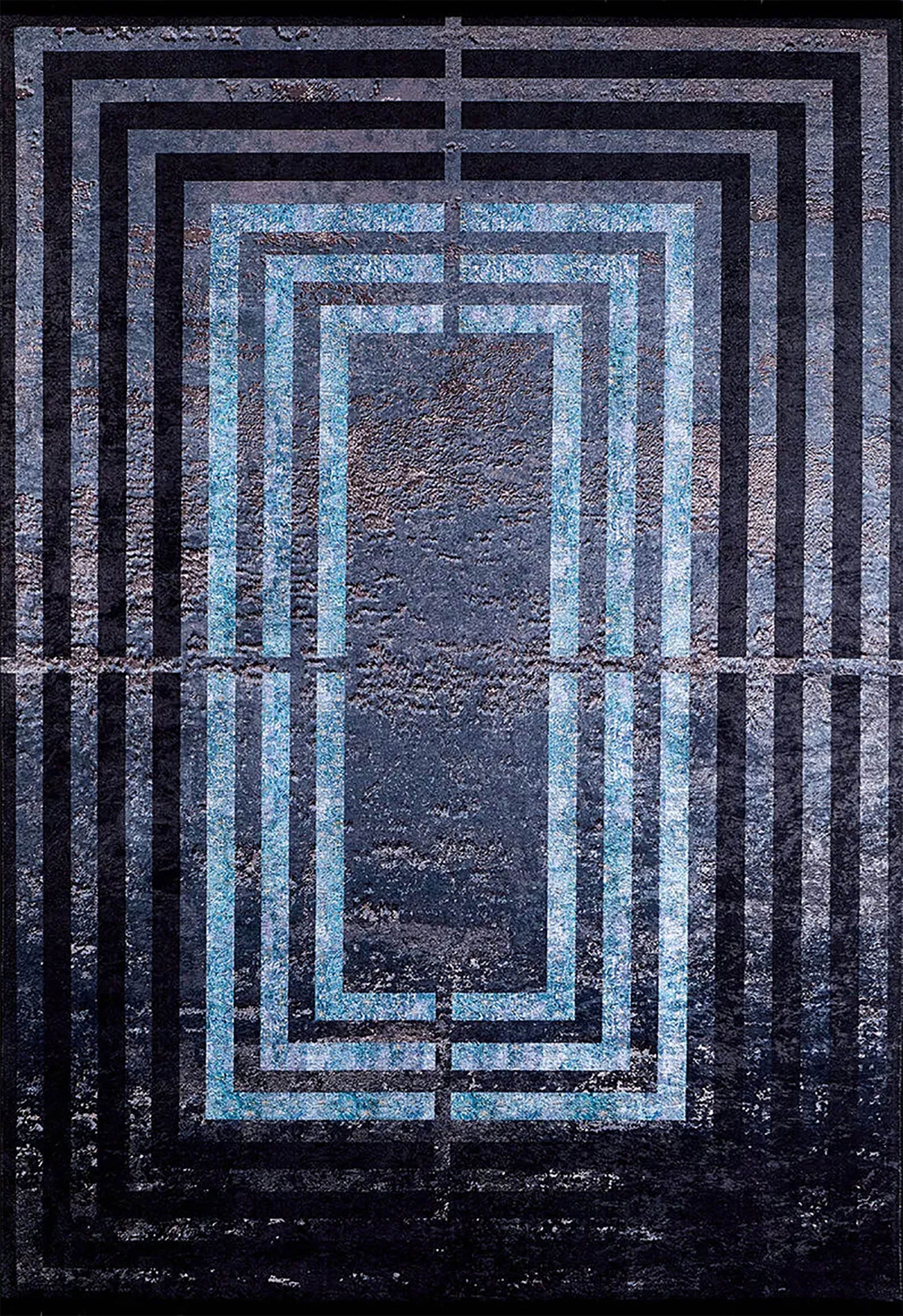 Koyu siyah/füme zemin üzerinde, Art Deco esintili canlı mavi tonlarında kalın geometrik dikdörtgen çerçeveye sahip modern halı. Dikey çizgili fonu ve eskitme dokusuyla dikkat çeker.
