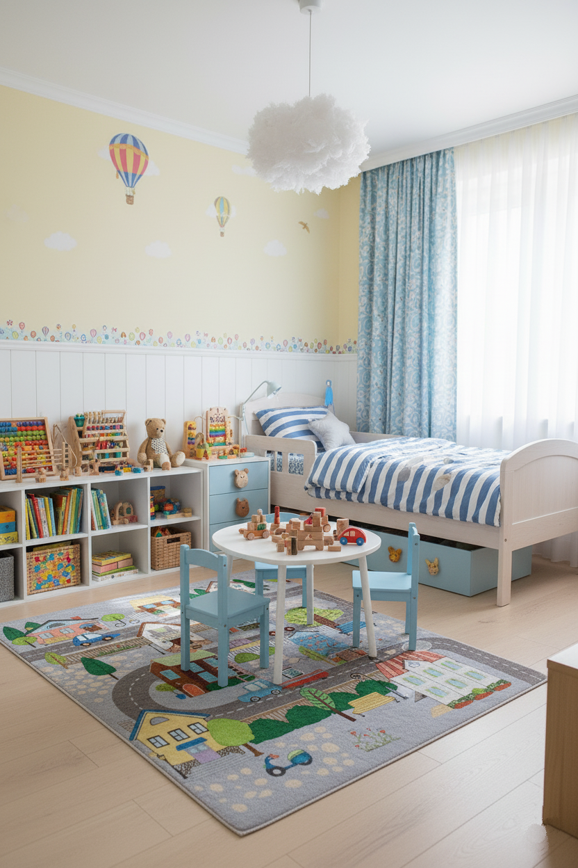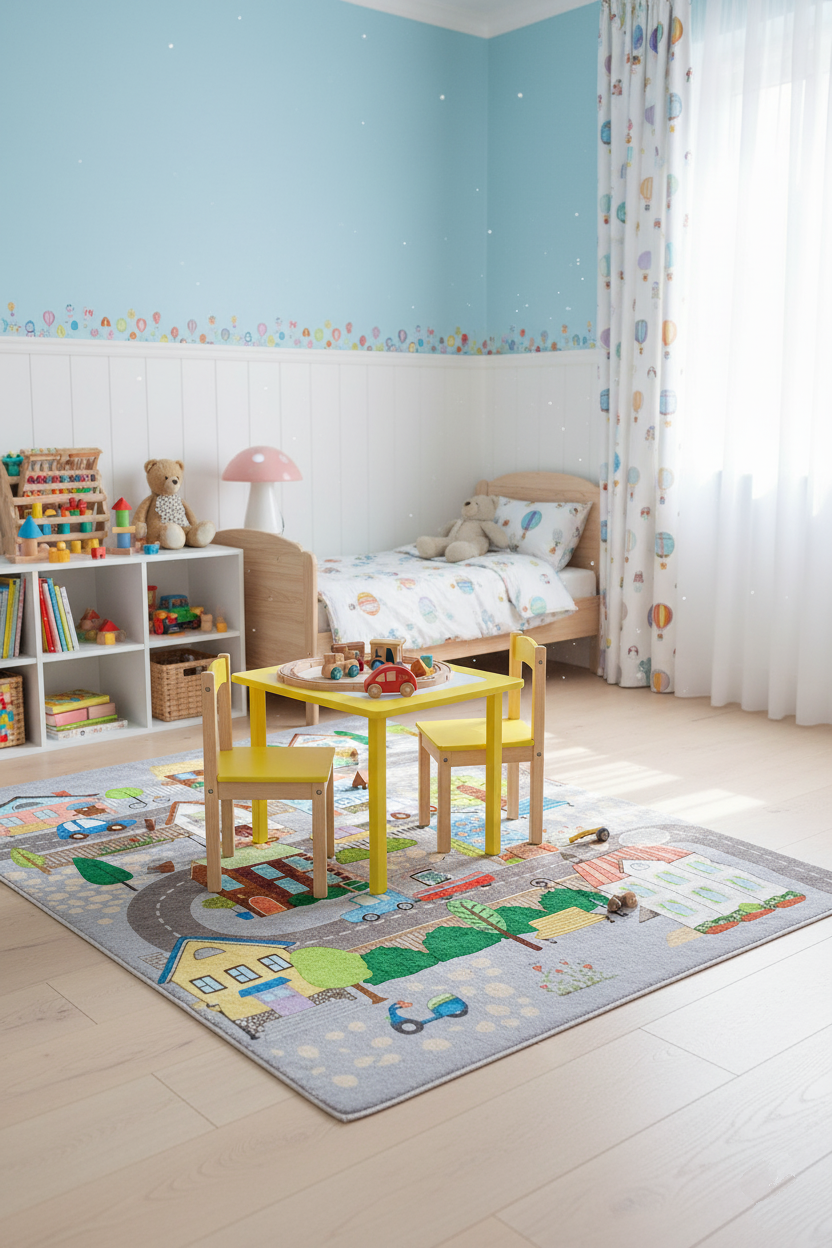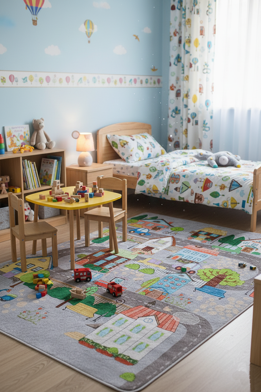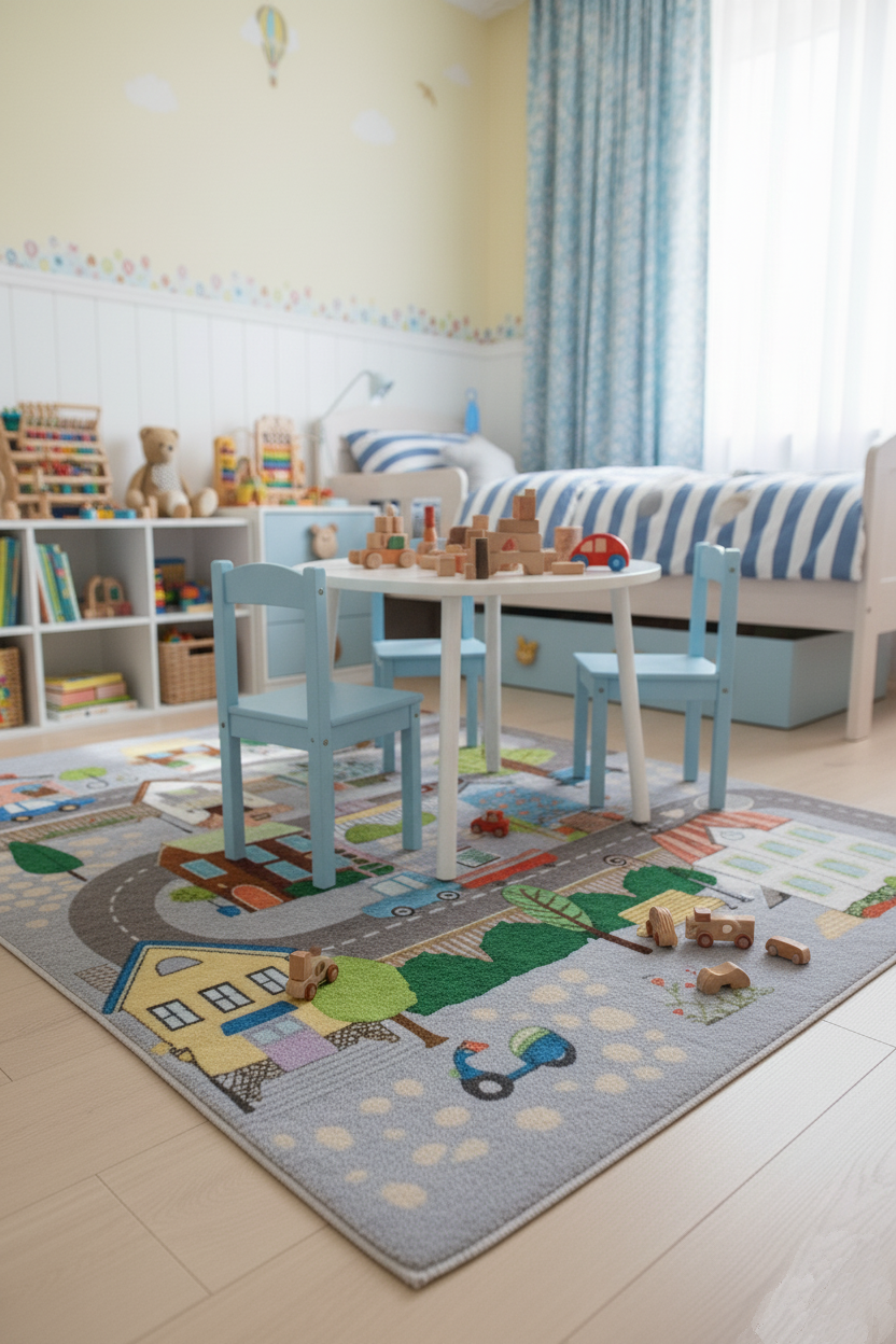 Eşsiz Trafik Temalı Çocuk Halısı, çocukların yaratıcı oyunlarını desteklemek için tasarlandı. Farklı boyut seçenekleriyle, çocukların arkadaşlarıyla birlikte eğlenceli ve etkileşimli bir şekilde vakit geçirmelerini sağlar. Hem oyun halısı olarak hem de dekoratif bir öğe olarak odada harika bir atmosfer yaratır. *Oyuncaklar dahildir.
