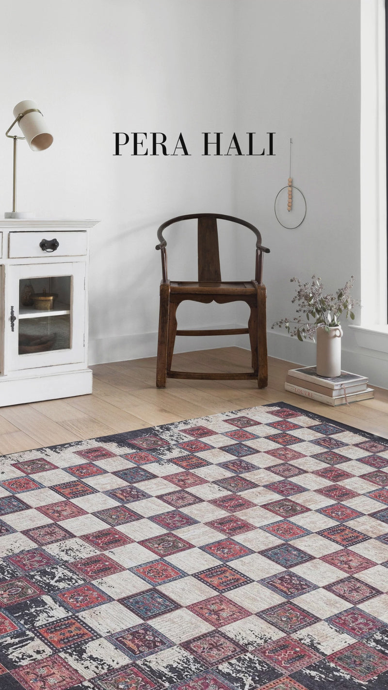 Eskitme etnik vintage halı, geometrik deseni ve antik tasarımıyla yaşam alanlarınıza şıklık ve zarif bir dokunuş katar. Her odada kullanılabilecek bu halı, oturma odası, yemek odası, yatak odası, mutfak, ev ofisi, antre, banyo ve koridorlar için harika bir seçimdir.