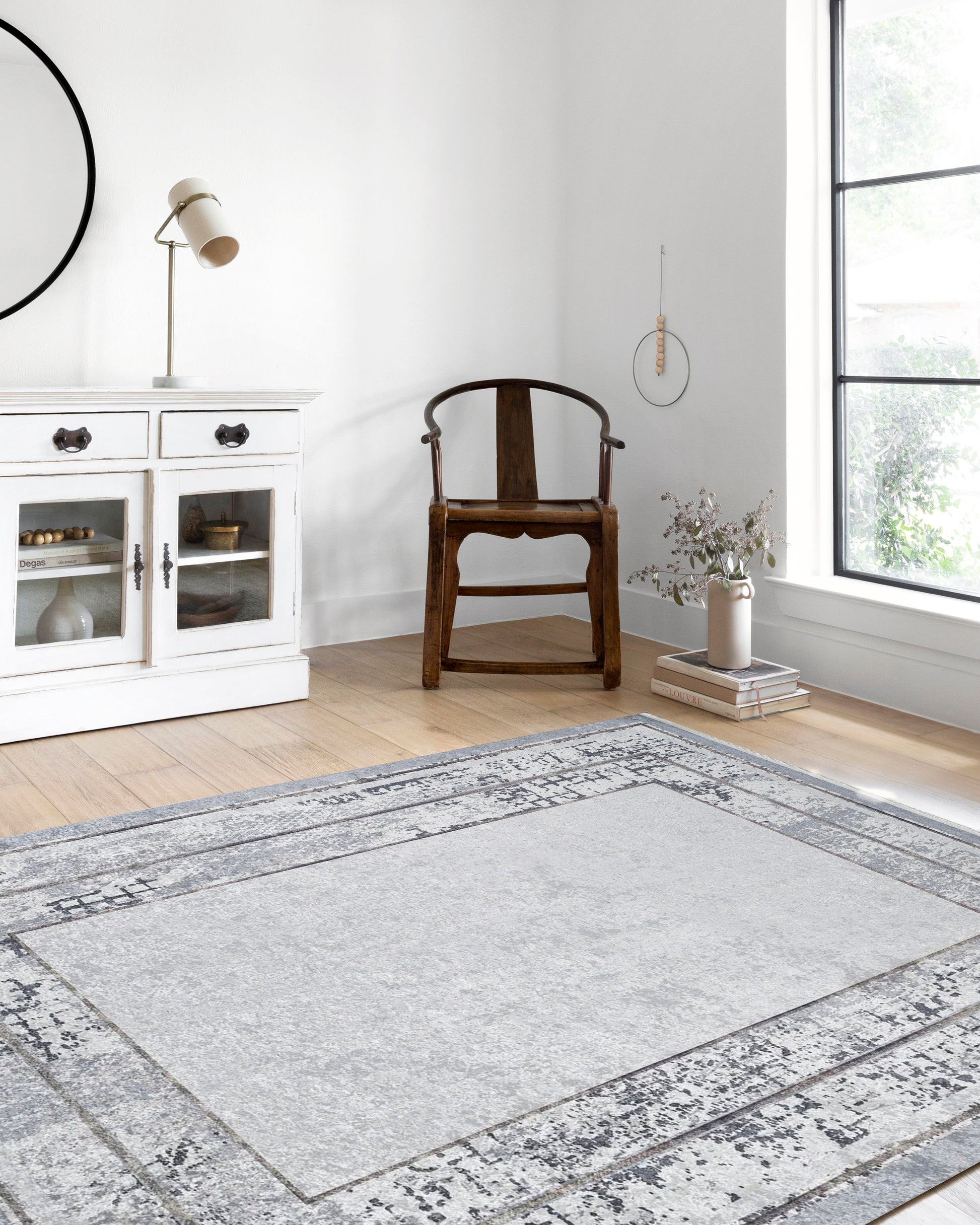 Modern ve minimalist tasarımıyla dikkat çeken bu halı, açık gri merkez paneli ve soyut, çerçeve detaylı bordürleriyle mekanınıza aydınlık ve ferah bir hava katar. Bordürdeki koyu gri ve füme dokunuşlar, sade desene derinlik katarken, zengin bir görünüm sağlar. Yumuşak dokusu ve kaymaz tabanı sayesinde çocuk odası, oturma odası ve antre gibi tüm yaşam alanlarında hem konforlu hem de güvenli bir kullanım sunar. Sade şıklığı arayanlar için ideal bir tercihtir.