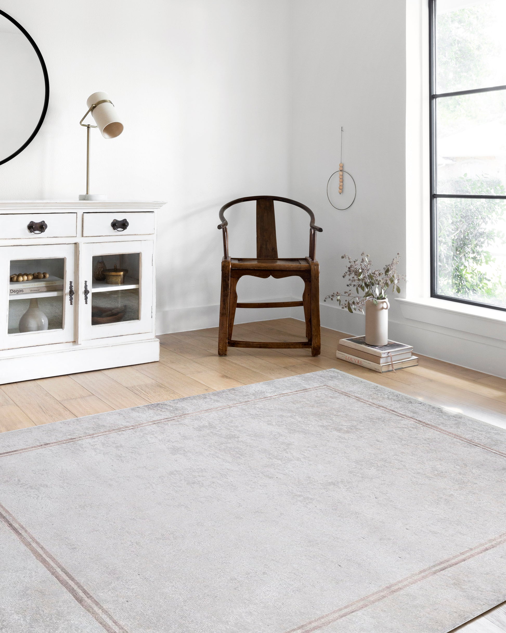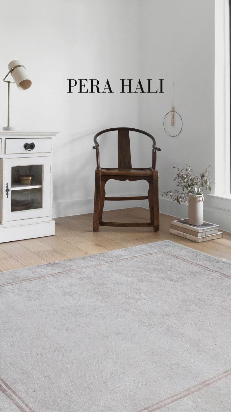 Modern ev dekorasyonuna uyum sağlayan bu halı, açık gri ve beyaz tonlarının ferahlatıcı etkisiyle ön plana çıkar. İnce bordür detayı, halıya şık bir çerçeve görünümü kazandırır. Yıkanabilir yapısı sayesinde kolayca temizlenebilir, kaymaz tabanı ile güvenli kullanım sunar.