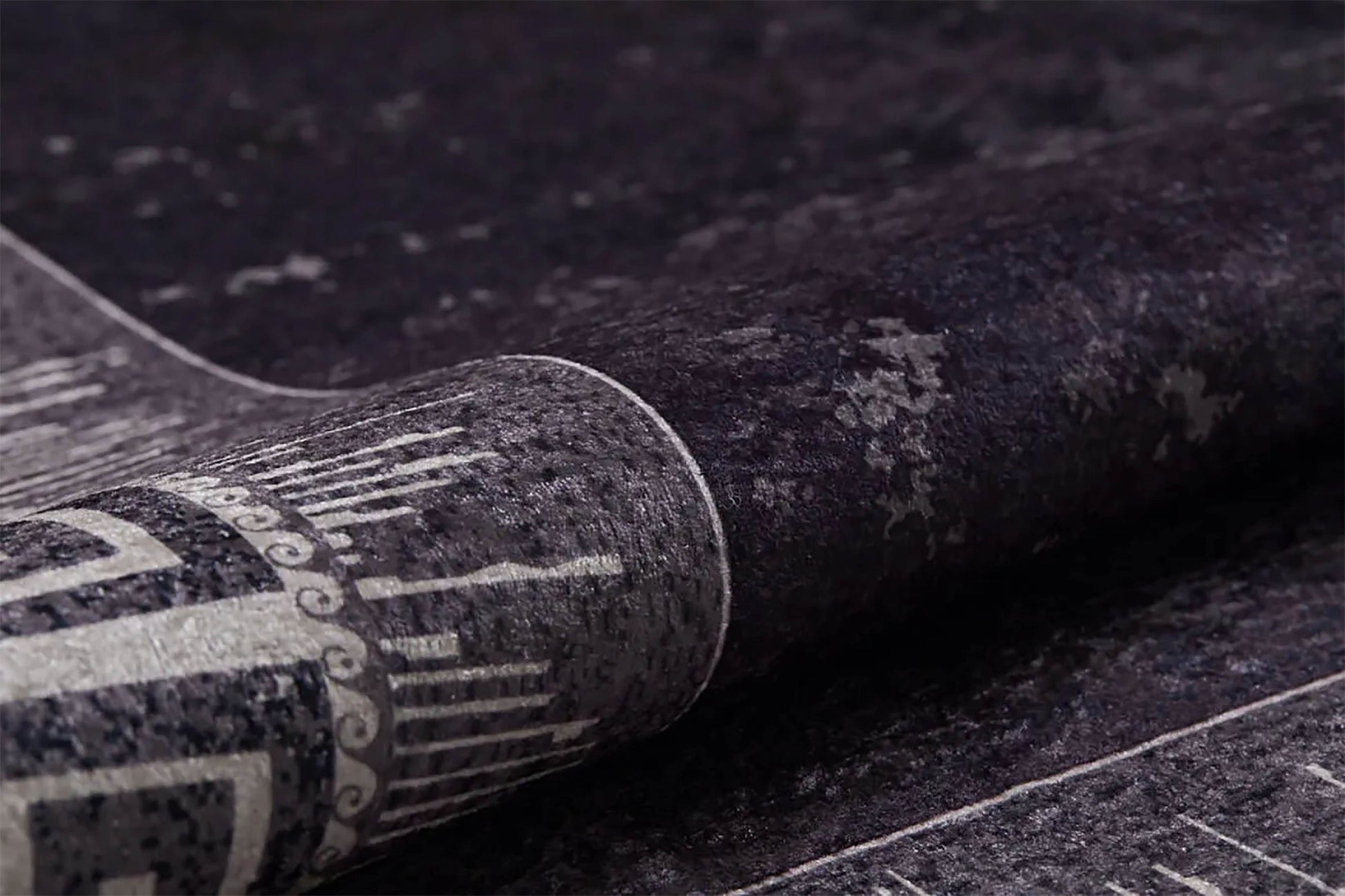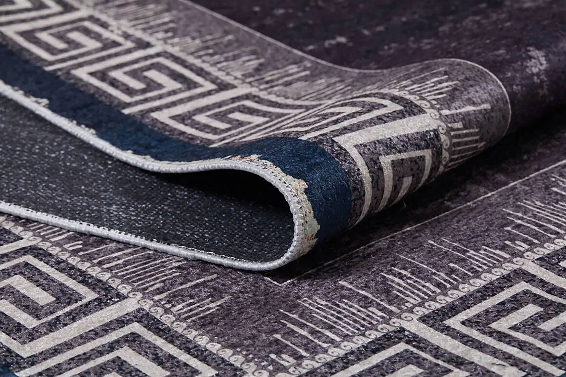 Odanıza zenginlik ve derinlik katacak, lüks görünümlü bir halı. Merkezindeki koyu mürdüm (bordo/mor karışımı) ve siyah tonlardaki eskitme (vintage) dokusuyla sofistike bir atmosfer yaratır. Halının etrafını çevreleyen kontrast oluşturan beyaz/açık gri Yunan anahtar (meander) bordürü, klasik bir zarafet ve dikkat çekici bir çerçeve sunar. Özellikle modern ve klasik detayları birleştiren lüks dekorasyonlar için mükemmel bir seçimdir.