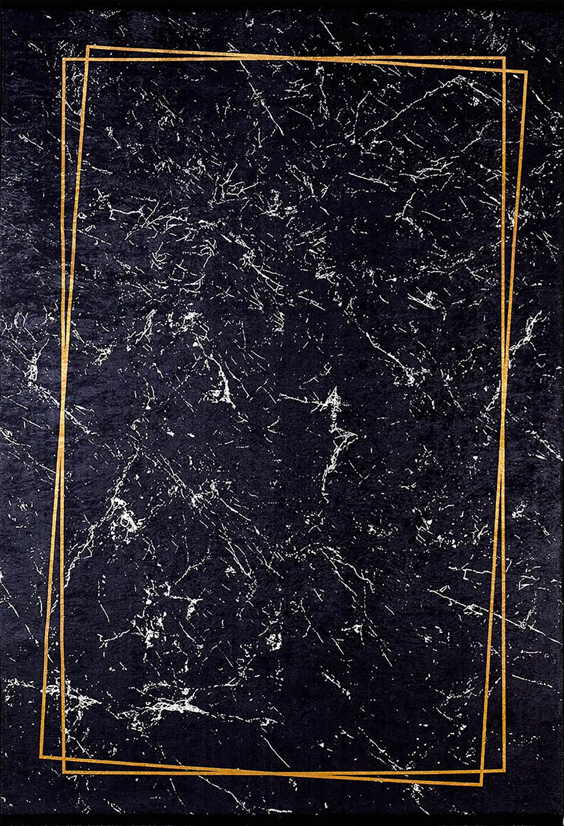Lüks Siyah Mermer Desenli İnce Gold Bordürlü Halı