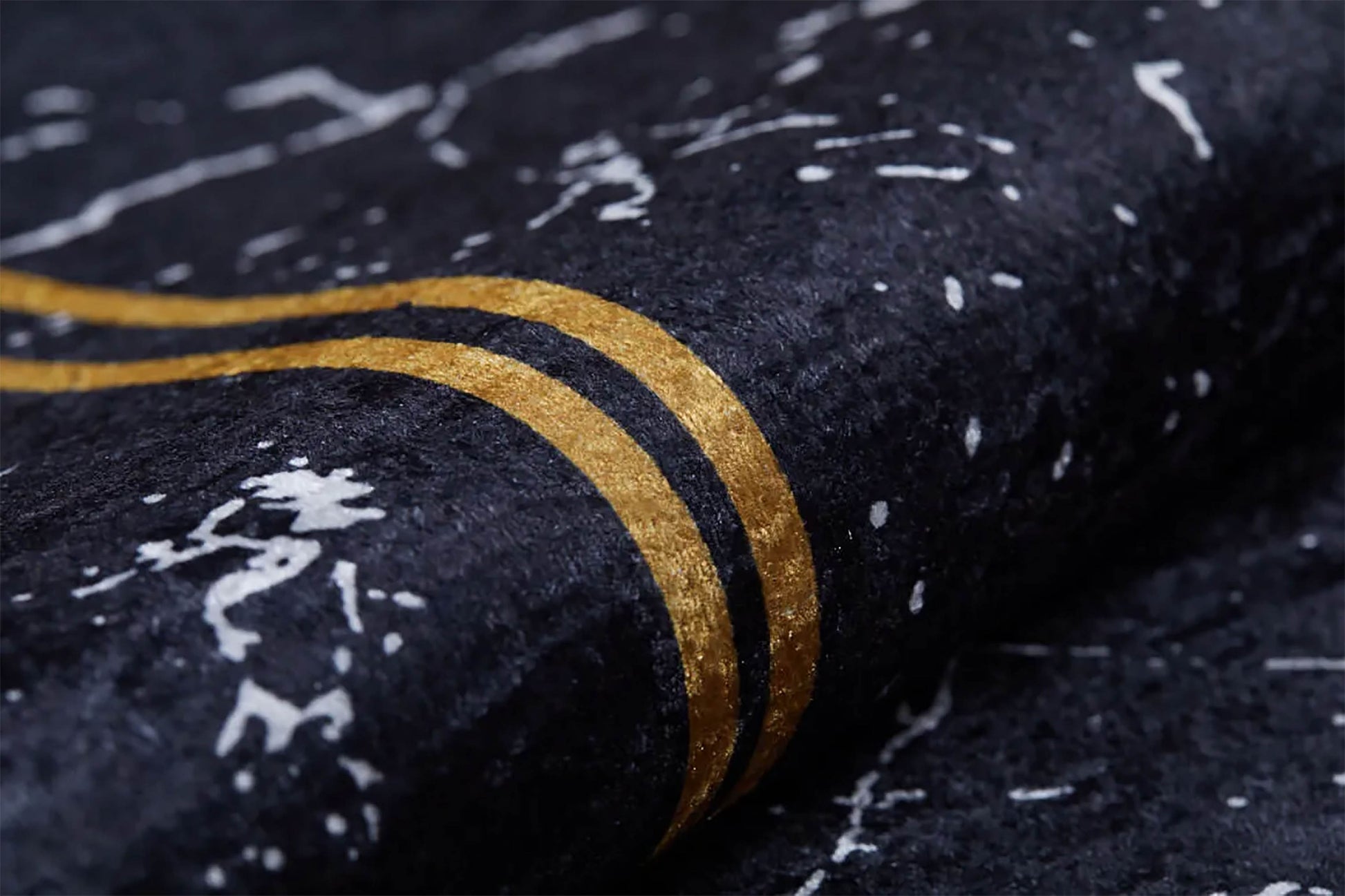 Siyah zemin üzerindeki mermer dokusu ve zarif gold/sarı çift çizgi bordür ile mekanınıza modern ve lüks bir hava katın. Çamaşır makinesinde yıkanabilir olması sayesinde temizlik ve hijyen kolaydır. Modern, şık ve tüy bırakmaz.