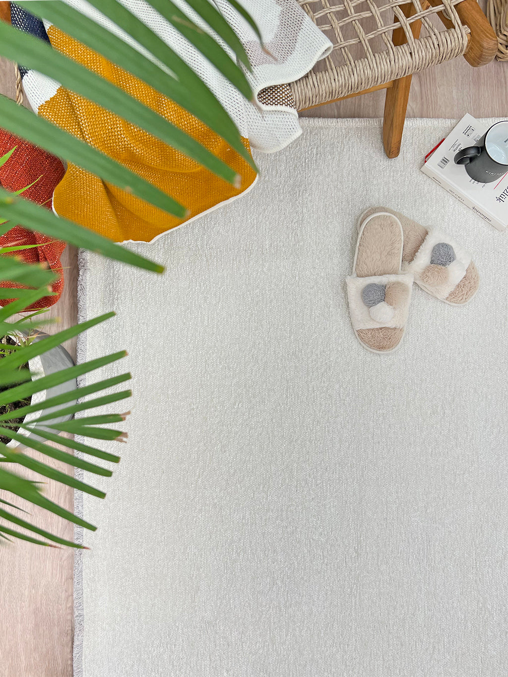 Beyaz & Bej renklerindeki bu halı, Pamuk ve Polyester malzemeden Makine Dokuma tekniğiyle üretilmiştir. Düz / Tek Renk deseniyle Modern, Minimal ve Yıkanabilir bir tarza sahiptir. 5–7 mm hav yüksekliği bulunan bu halı, Dikdörtgen ve Yolluk şeklinde mevcuttur. Salon, Çocuk Odası, Mutfak, Yolluk, Antre ve Oda gibi evin birçok farklı alanında kullanıma uygundur. Çamaşır makinesinde yıkanabilir olması kolay temizlik sağlarken, baskı boyama olmadığı için renk vermez. Aynı zamanda antibakteriyel ve antialerjik özellikleriyle sağlıklı bir ortam sunar, koku yapmaz, hav ve tüy çıkarmaz. Ürün, 2 yıl üretim ve işçilik hatalarına karşı garantilidir.