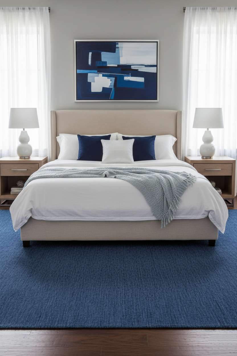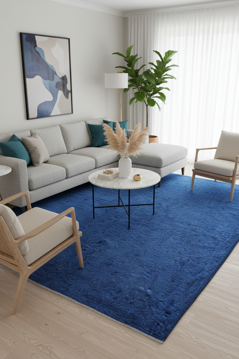 Minimalist ve şık tasarımıyla öne çıkan Mavi Pamuk Polyester Modern Düz Yıkanabilir Antibakteriyel Halı, evinizin her alanında ferah ve zarif bir görünüm sunar. Tek renkli, yalın çizgisi sayesinde dekorasyonunuzla kolayca uyum sağlar. %60 pamuk ve %40 polyester iplikten makine dokuma tekniğiyle üretilmiş olup, hem dayanıklı hem de yumuşak dokusuyla konforlu bir kullanım sunar. 5–7 mm hav yüksekliği ile günlük kullanıma uygun bu model, çamaşır makinesinde yıkanabilir özelliğiyle pratik temizlik imkânı sağlar.