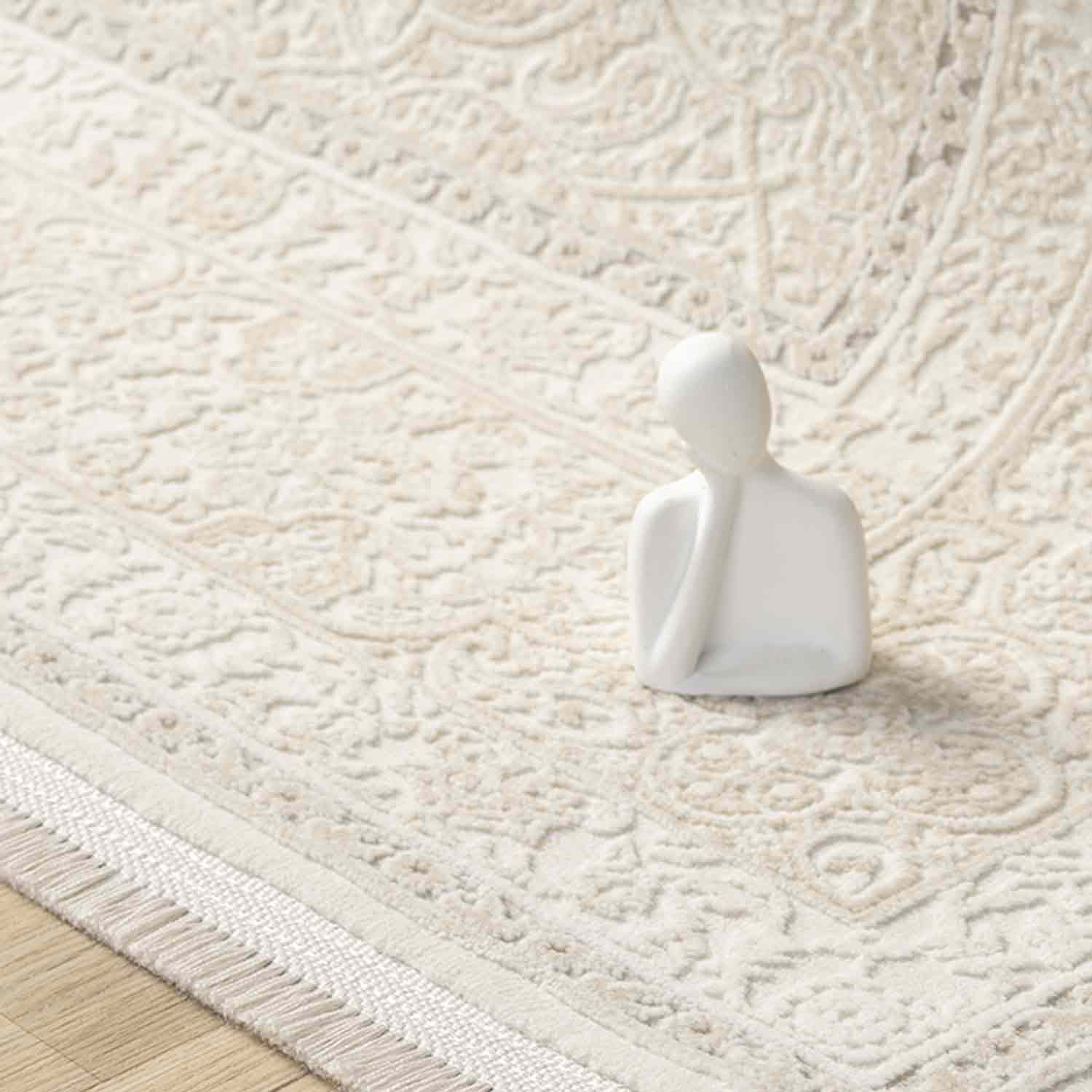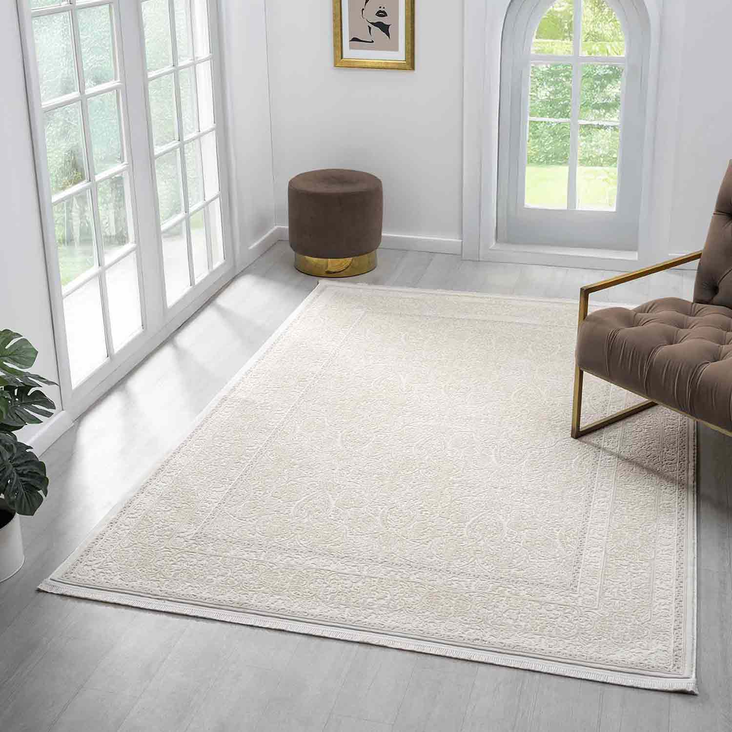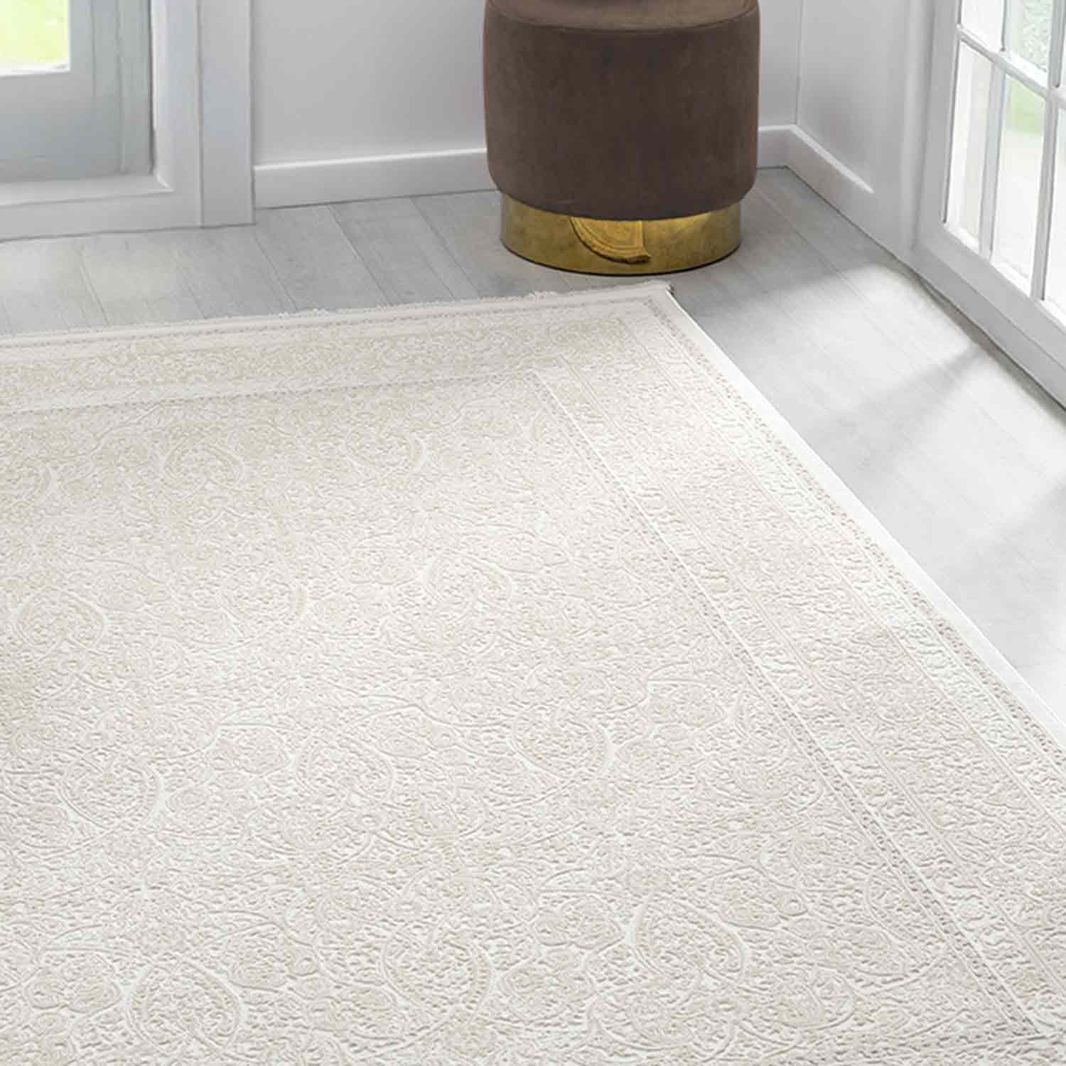 Modern ev dekorasyonuna uyum sağlayan, pratik kullanımlı ve şık halılarımızla tanışın! Bu dijital baskılı, yıkanabilir halı; krem ve bej tonlarının ton sür ton kabartmalarıyla, geleneksel klasik desenleri minimalist ve zarif bir şekilde sunar. Halıdan çok, zemine lüks bir dantel örtü serilmiş gibi duruyor. Kolay temizlenebilir yapısıyla çocuklu ve evcil hayvanlı evler için idealdir. Evinizin havasını anında değiştirin!