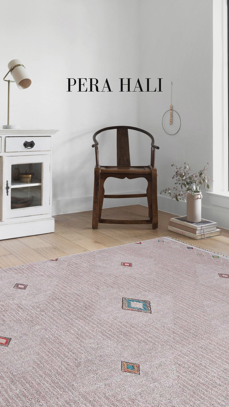 Dieser Kelim-Teppich im Vintage-Stil besticht durch sein creme- und beigefarbenes geometrisches Muster auf blassrosa Hintergrund und einen eleganten und stilvollen Look. Er verbindet traditionelle Textur mit modernem Stil und ist die perfekte Wahl für Wohnzimmer, Schlafzimmer, Essbereiche und Eingangsbereiche.