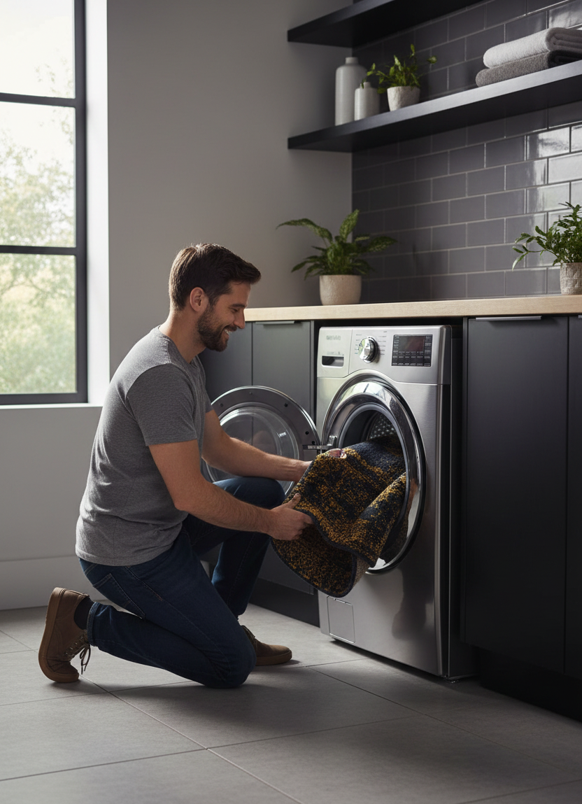 Für die tägliche Reinigung können Sie einen Staubsauger oder Saugroboter verwenden. Verschüttete Flüssigkeiten sollten Sie sofort mit einem Papiertuch oder einem trockenen Tuch abtupfen. Für eine gründlichere Reinigung können Sie Ihren Teppich bei 30 °C in der Waschmaschine waschen, ohne Schleudern oder Bleichen. Um die rutschfeste Unterseite über viele Jahre zu erhalten, empfiehlt es sich, auf einen Trockner zu verzichten und den Teppich an einem Ort ohne direkte Sonneneinstrahlung zu trocknen.