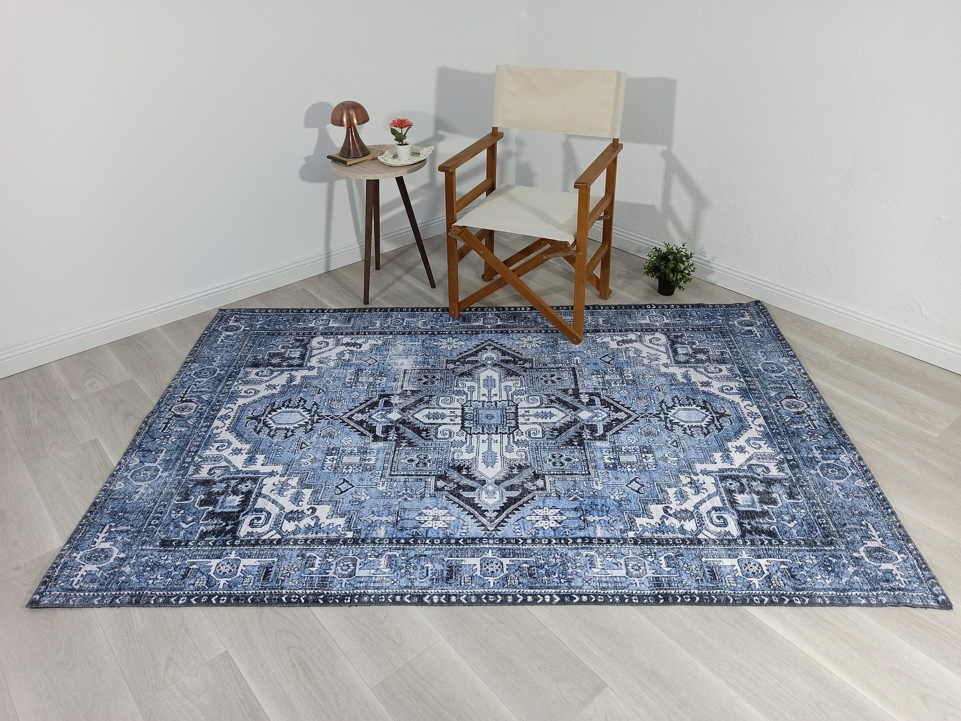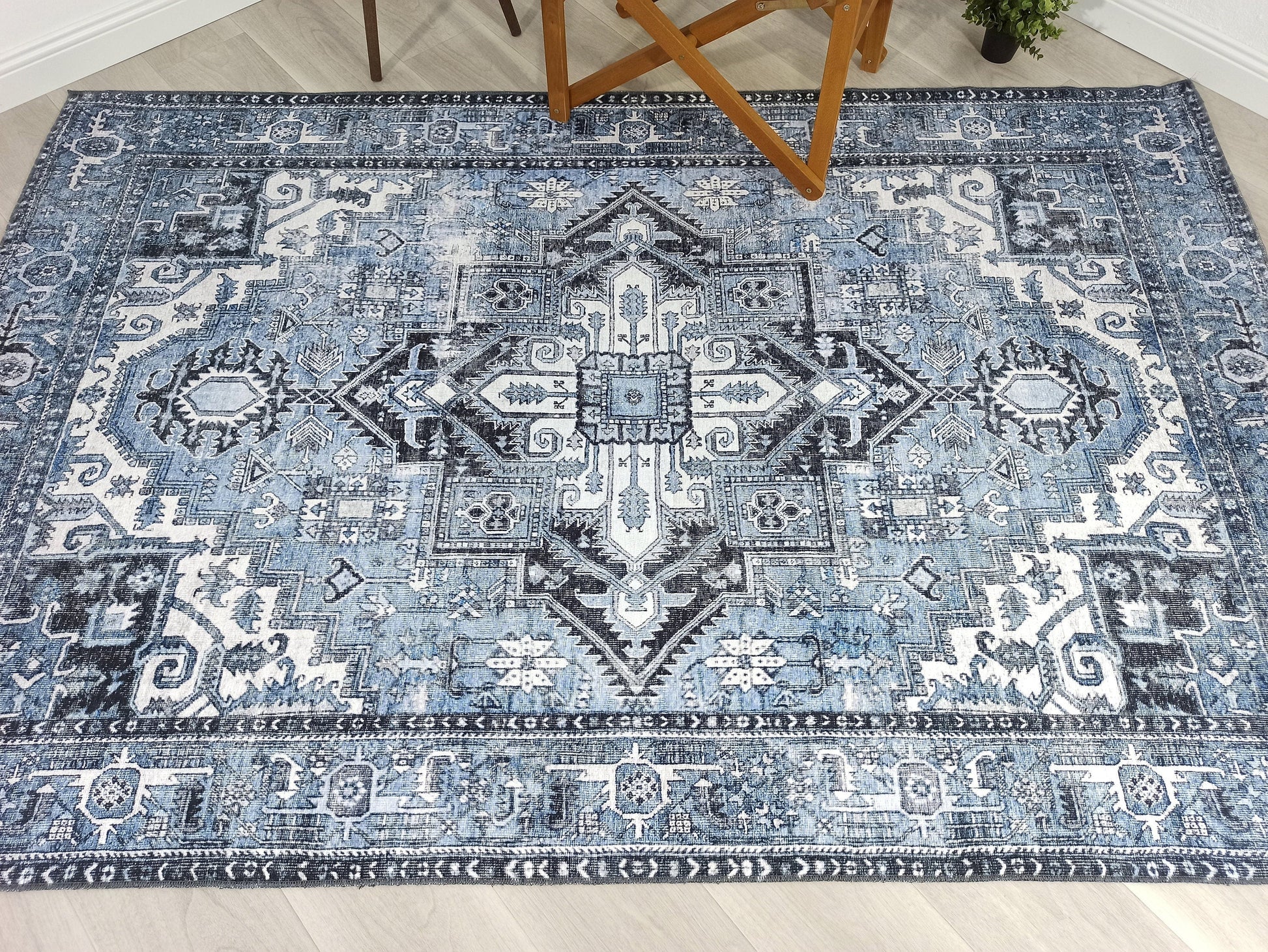 Dieser Teppich im Vintage-Stil besticht durch sein geometrisches Muster, das Schwarz- und Grautöne mit beigen Motiven kombiniert. Das Design, das einen Hauch von Bohème versprüht, vereint Eleganz und Komfort dank handgewebter Drucktechnik. Seine dünne, rutschfeste Oberfläche macht ihn für alle Wohnbereiche geeignet, darunter Wohnzimmer, Esszimmer, Schlafzimmer, Küche, Arbeitszimmer, Eingangsbereich, Badezimmer und Flur.