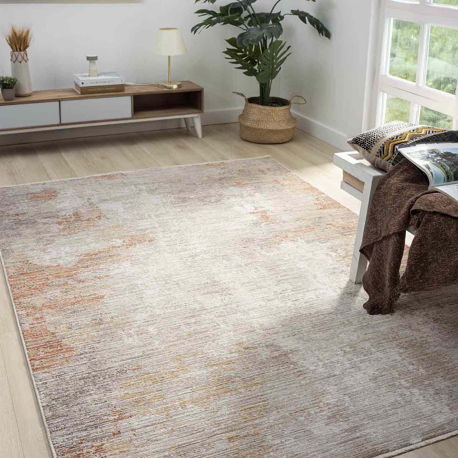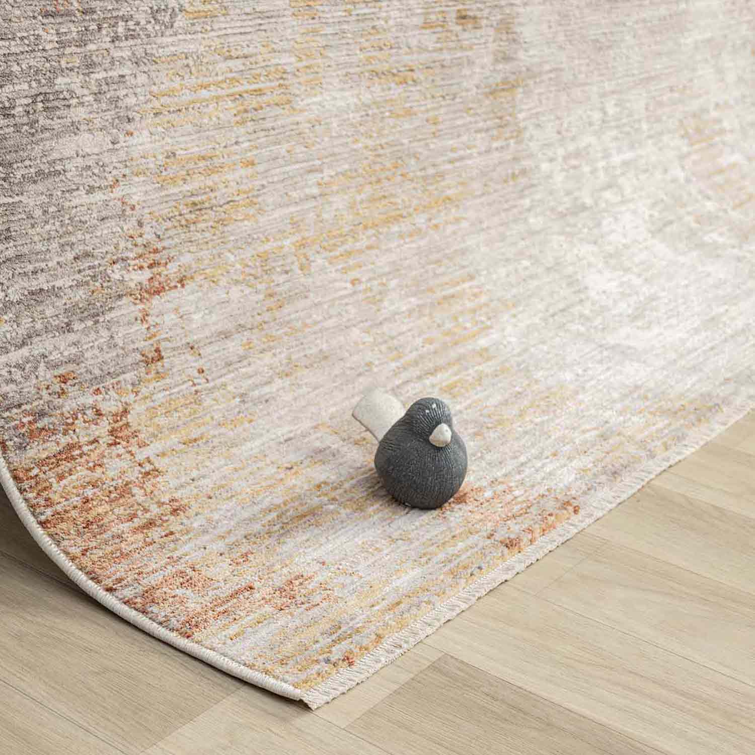 Modern ev dekorasyonuna uyum sağlayan, pratik kullanımlı ve şık halılarımızla tanışın! Bu dijital baskılı, yıkanabilir halı; açık gri, bej ve yoğun kahve/pas tonlarının soyut eskitme (vintage/distressed) efektini birleştirir. Adeta bir tablonun zemine yansımış hali, ama üzerine basabilirsiniz. Kolay temizlenebilir yapısıyla çocuklu ve evcil hayvanlı evler için idealdir. Evinizin havasını anında değiştirin!
