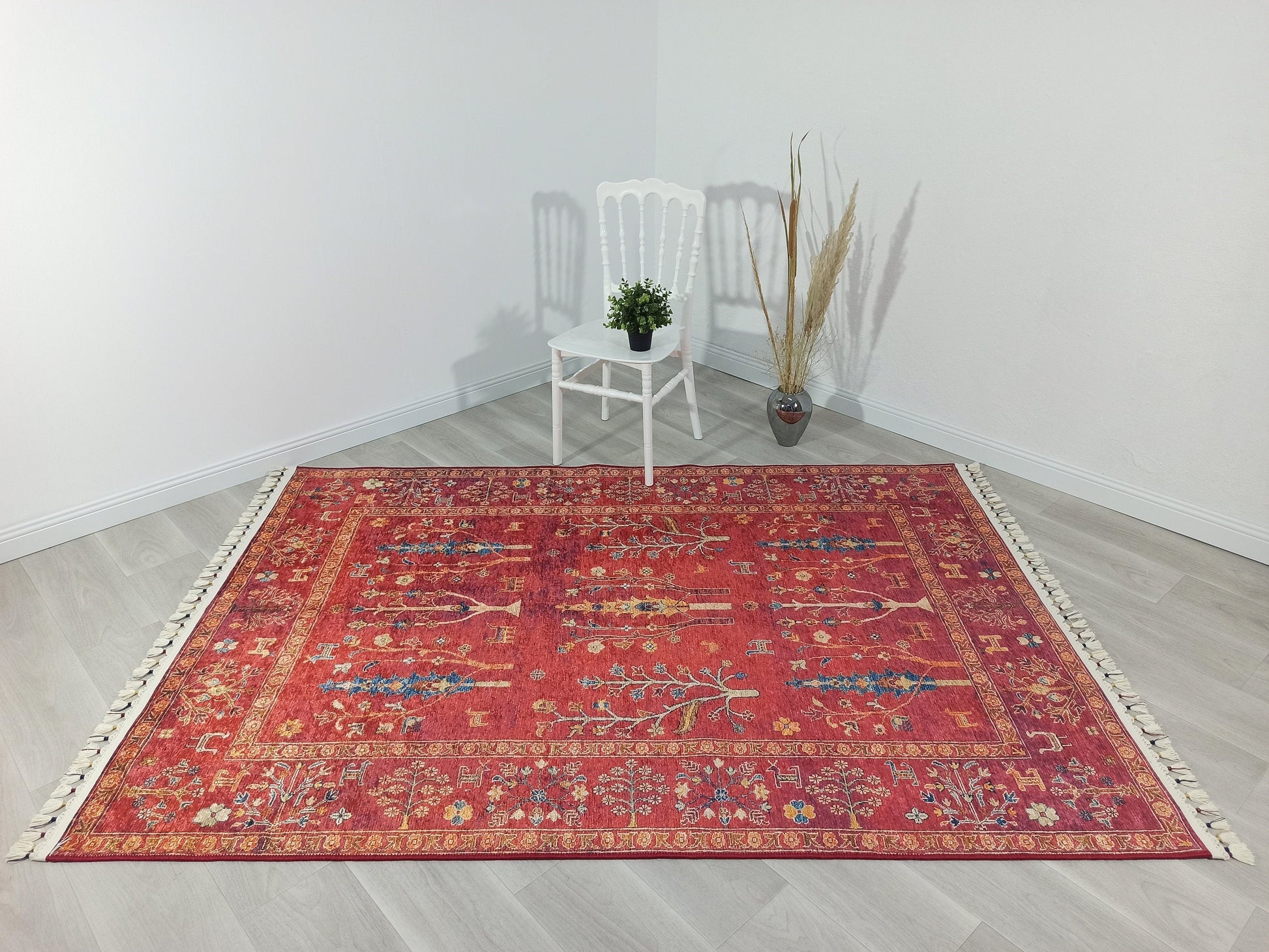 Inspired by traditional Anatolian rugs, this red rug exudes an authentic atmosphere with its beige motifs and tassel details. Combining antique design with vintage geometric patterns, this rug adds a warm and stylish touch to your living spaces.