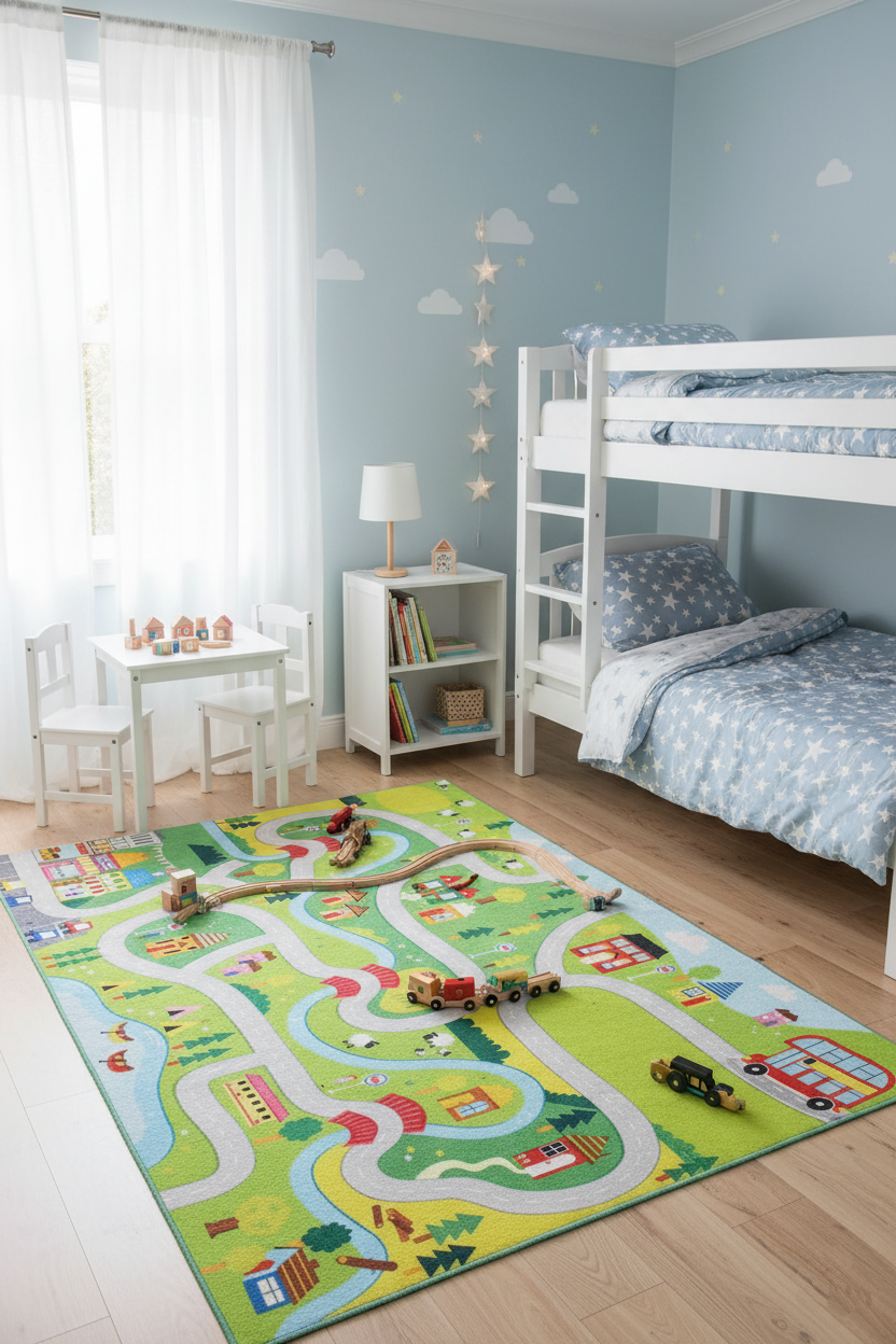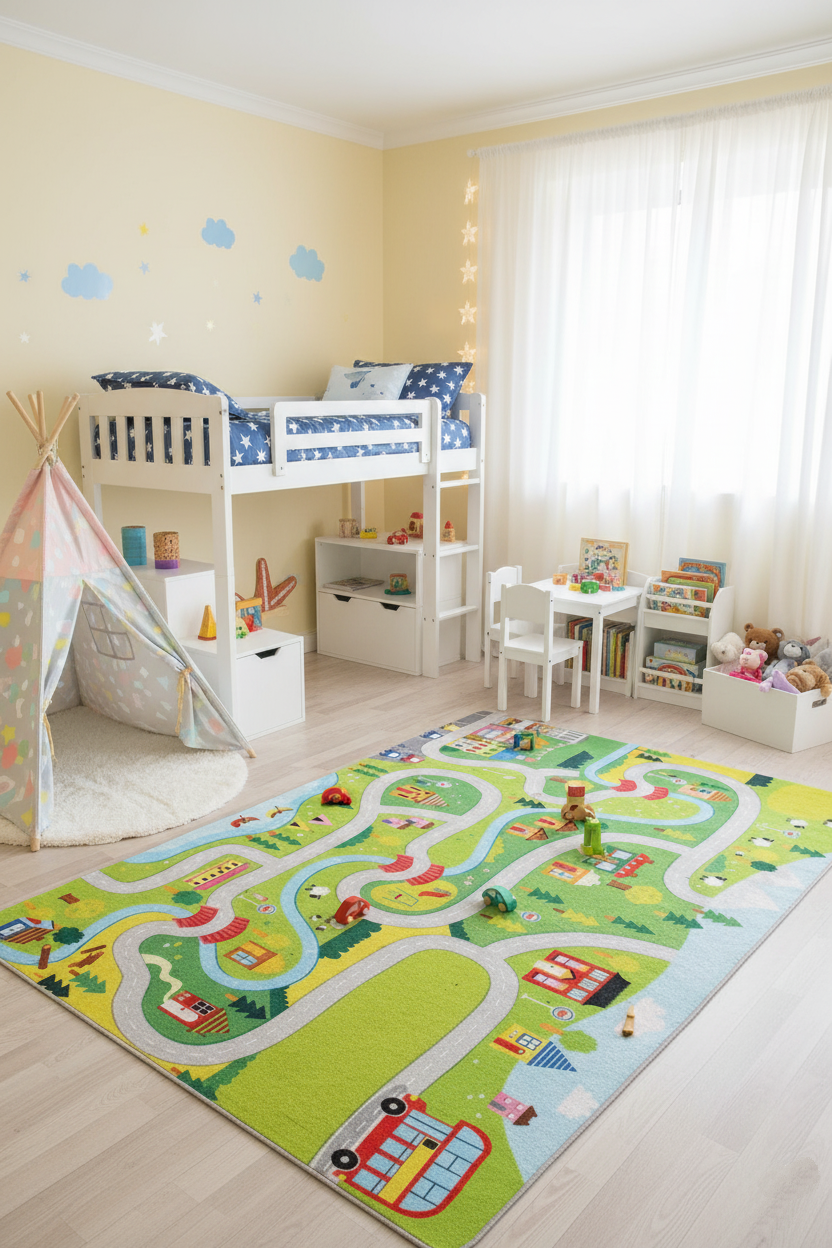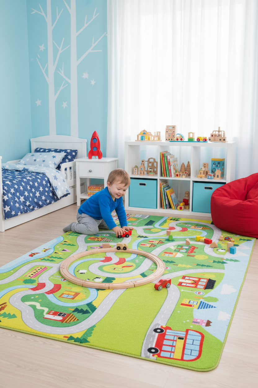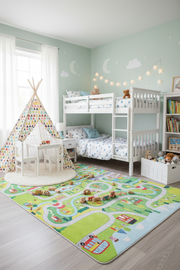 Designed for children to engage in fun and creative play, this special city map patterned rug offers an interactive play area with roads, buildings, and various city elements. It's not just a play rug, it's also a decorative addition to children's rooms and play areas.