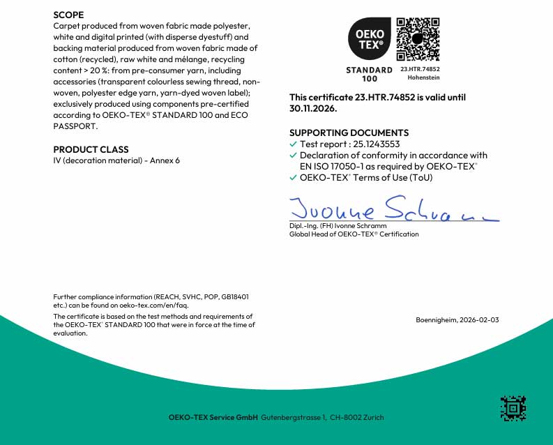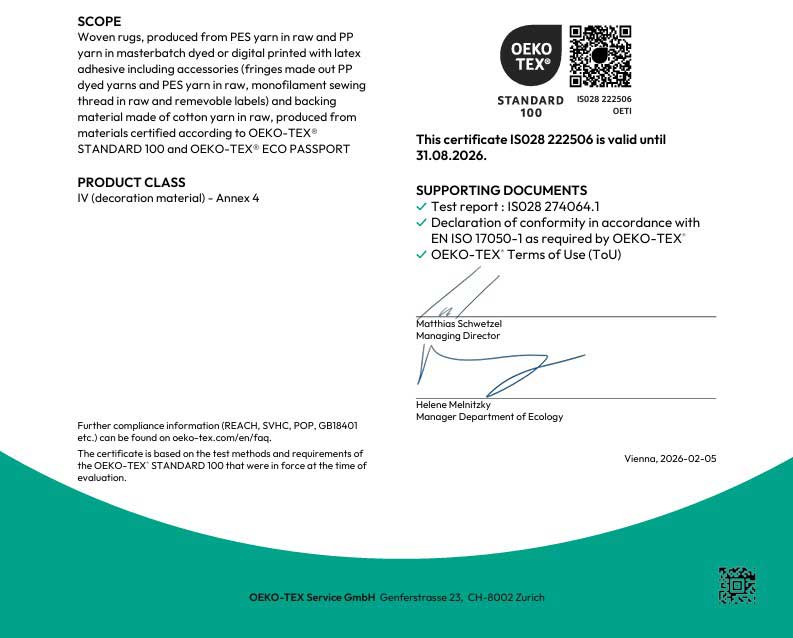 Halılarımızın her bir ilmeği, dünyaca ünlü OEKO-TEX® Standart 100 güvencesiyle test ediliyor. İçerisinde sağlığınızı tehdit edecek tek bir zararlı maddeye yer yok. Bebeğiniz üzerinde emeklerken, evcil dostunuz mışıl mışıl uyurken sizin de içiniz hep rahat olsun diye...