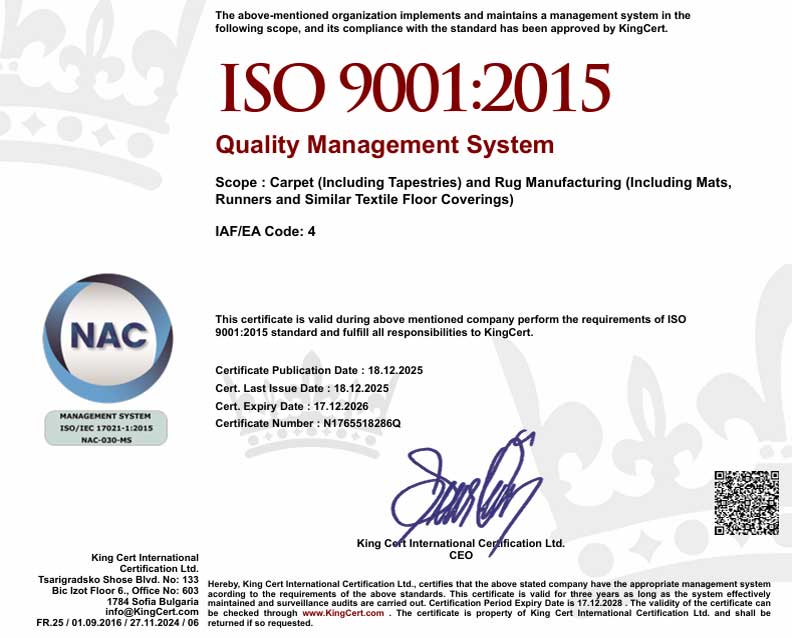 Tasarım aşamasından kapınıza gelen o ana kadar her detayda dünya standartlarını (ISO 9001) takip ediyoruz. Size sadece bir halı değil, yıllarca güvenle kullanacağınız kusursuz bir deneyim sunmak en büyük tutkumuz.