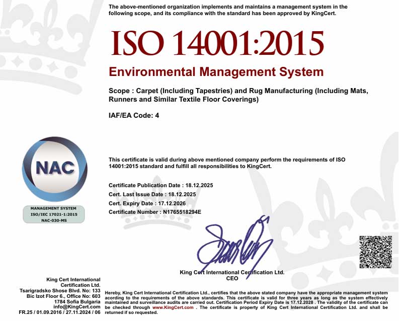 Doğanın renklerinden ilham alırken, ona zarar vermemeyi bir borç biliyoruz. ISO 14001 Çevre Yönetim Sistemi ile atıklarımızı yönetiyor, kaynaklarımızı koruyoruz. Çünkü biliyoruz ki, en güzel halı, temiz bir dünyada serilendir.