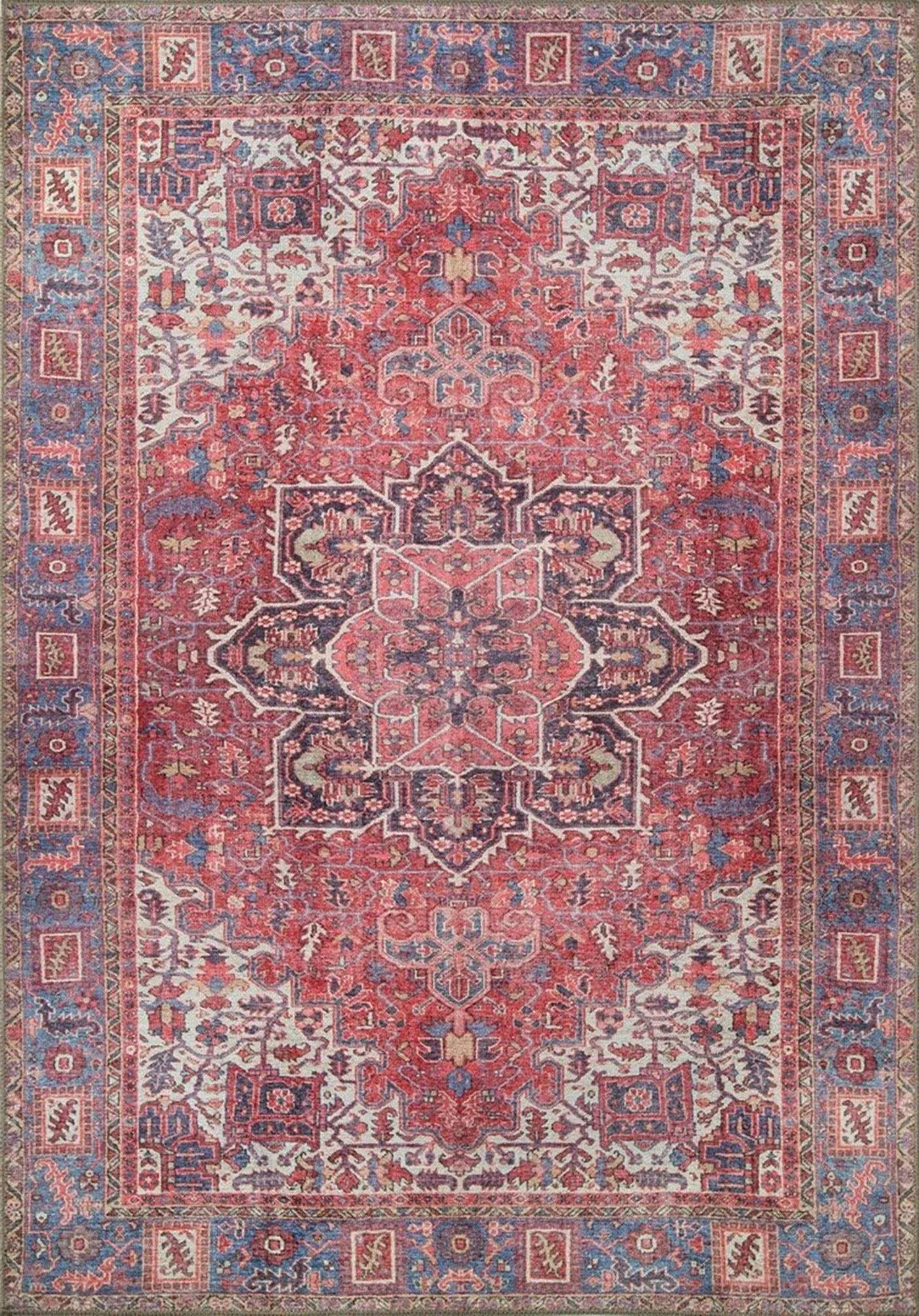 Klasik zarafetin en sıcak halini evinize davet edin. Zamanın etkisiyle yumuşamış solgun kırmızı ve gül kurusu zemin üzerinde parlayan mavi ve krem detaylar, bu halıya eşsiz bir vintage karakter kazandırır.