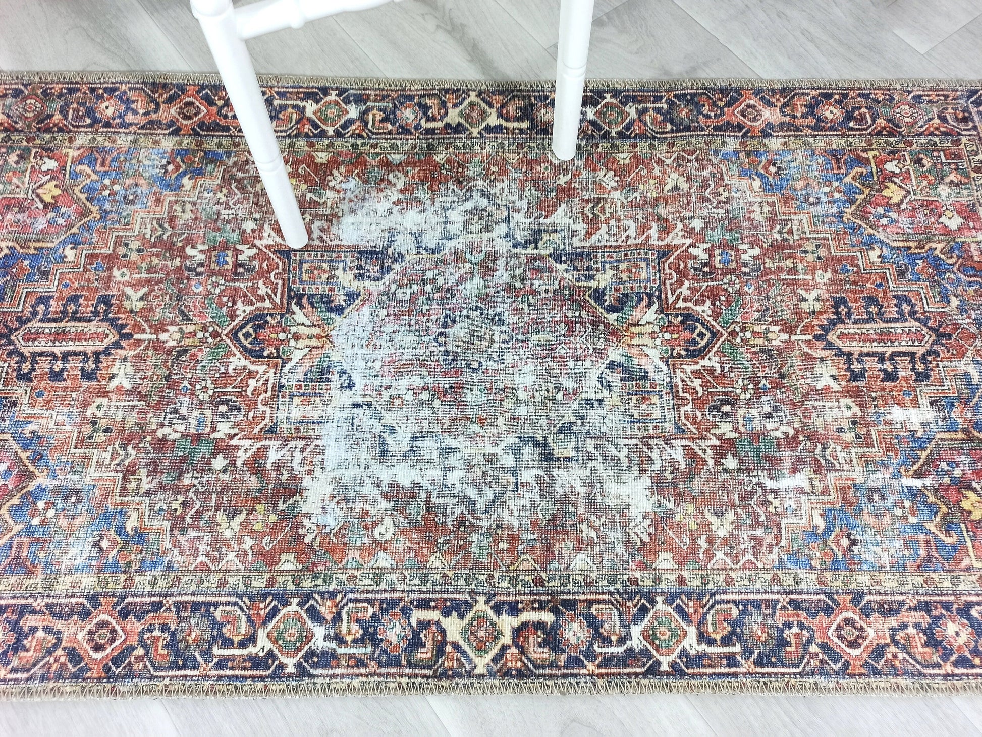 Terracotta ve Lacivert Eskitme Medalyonlu Vintage Halı